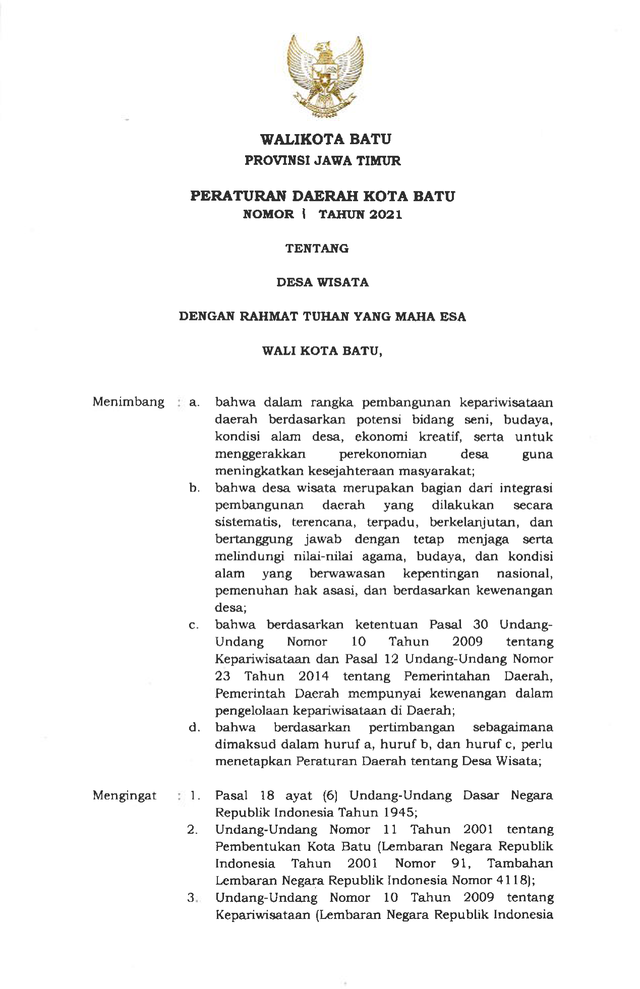 PERDA Nomor 1 Tahun 2021 | Peraturan Daerah Nomor 1 Tahun 2021 tentang PERATURAN DAERAH KOTA BATU NOMOR 1 TAHUN 2021 TENTANG DESA WISATA