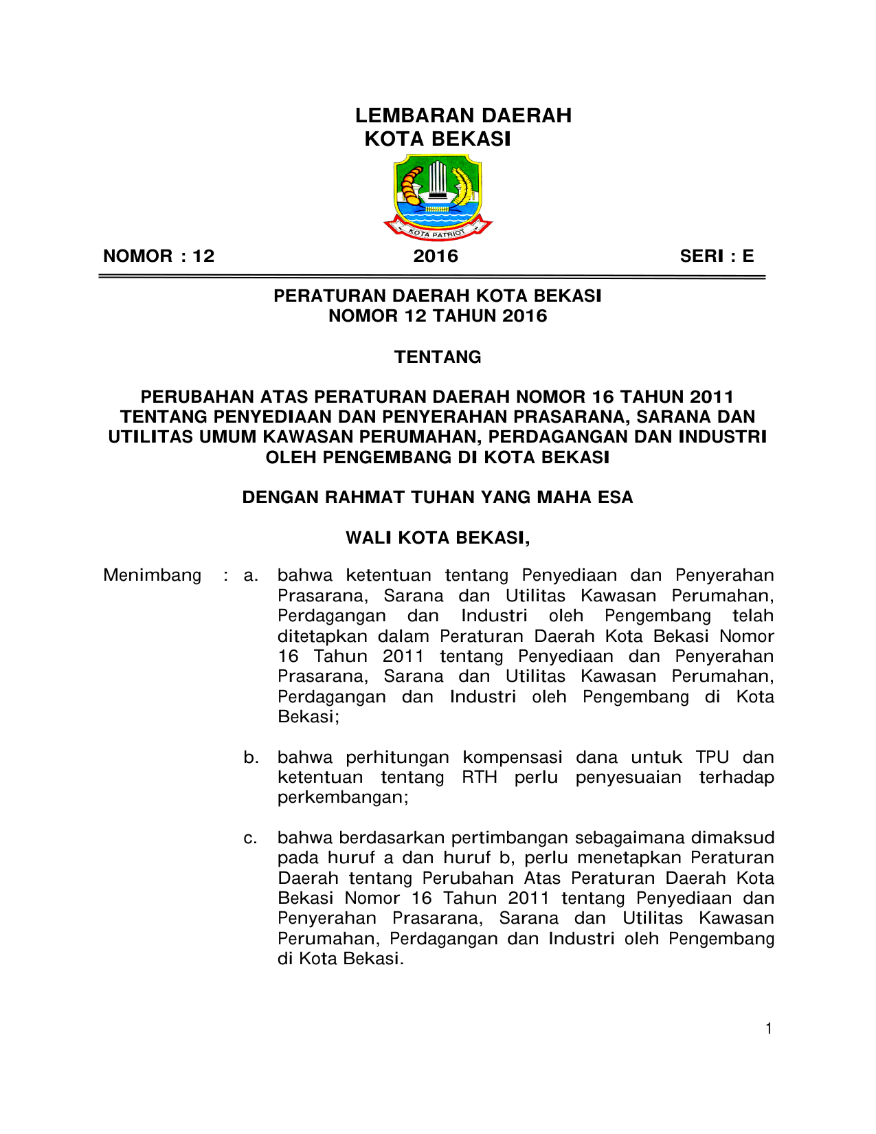 PERDA Nomor 12 Tahun 2016 | Peraturan Daerah Nomor 12 Tahun 2016 tentang PERUBAHAN ATAS PERATURAN DAERAH NOMOR 16 TAHUN 2011TENTANG PENYEDIAAN DAN PENYERAHAN PRASARANA, SARANA DANUTILITAS UMUM KAWASAN PERUMAHAN, PERDAGANGAN DAN INDUSTRIOLEH PENGEMBANG DI KOTA BEKASI