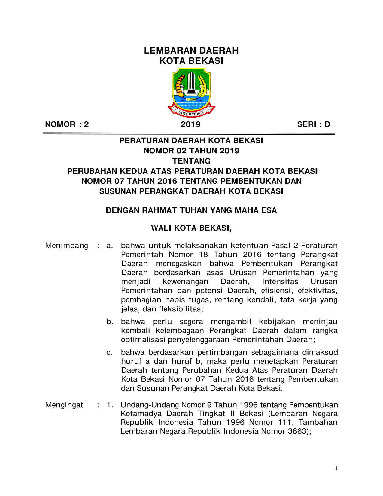 PERDA Nomor 2 Tahun 2019 | Peraturan Daerah Nomor 2 Tahun 2019 tentang PERUBAHAN KEDUA ATAS PERATURAN DAERAH KOTA BEKASINOMOR 07 TAHUN 2016 TENTANG PEMBENTUKAN DANSUSUNAN PERANGKAT DAERAH KOTA BEKASI