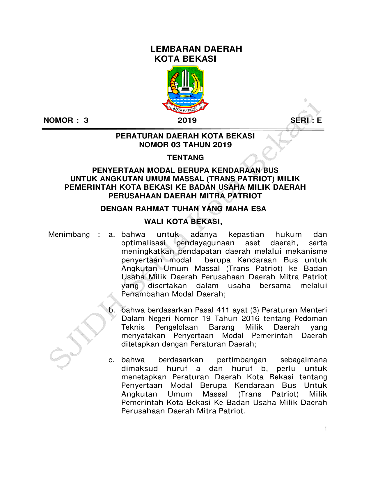 PERDA Nomor 3 Tahun 2019 | Peraturan Daerah Nomor 3 Tahun 2019 tentang PENYERTAAN MODAL BERUPA KENDARAAN BUSUNTUK ANGKUTAN UMUM MASSAL (TRANS PATRIOT) MILIKPEMERINTAH KOTA BEKASI KE BADAN USAHA MILIK DAERAHPERUSAHAAN DAERAH MITRA PATRIOT