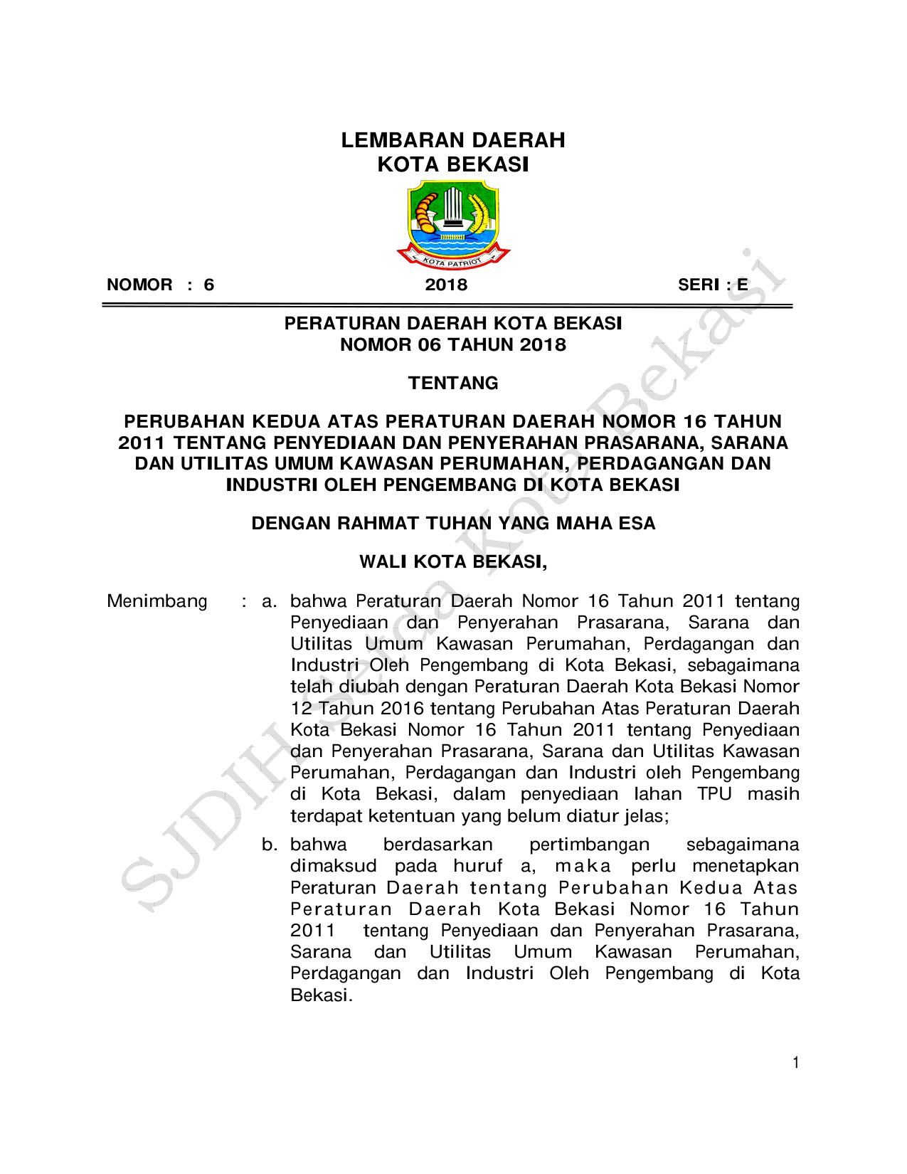 PERDA Nomor 6 Tahun 2018 | Peraturan Daerah Nomor 6 Tahun 2018 tentang PERUBAHAN KEDUA ATAS PERATURAN DAERAH NOMOR 16 TAHUN2011 TENTANG PENYEDIAAN DAN PENYERAHAN PRASARANA, SARANADAN UTILITAS UMUM KAWASAN PERUMAHAN, PERDAGANGAN DANINDUSTRI OLEH PENGEMBANG DI KOTA BEKASI