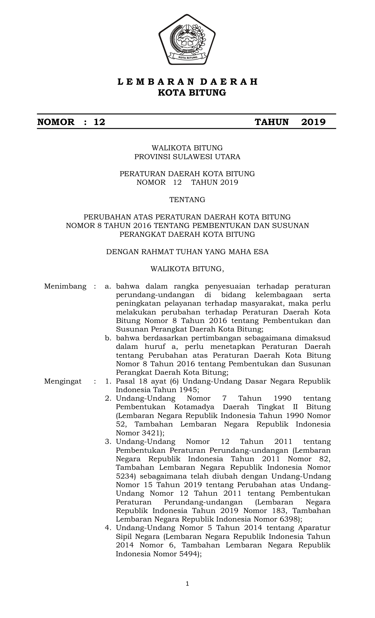 PERDA Nomor 12 Tahun 2019 | Peraturan Daerah Nomor 12 Tahun 2019 tentang PERUBAHAN ATAS PERATURAN DAERAH KOTA BITUNGNOMOR 8 TAHUN 2016 TENTANG PEMBENTUKAN DAN SUSUNANPERANGKAT DAERAH KOTA BITUNG