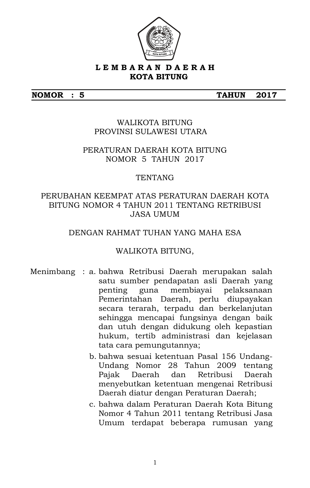 PERDA Nomor 5 Tahun 2017 | Peraturan Daerah Nomor 5 Tahun 2017 tentang PERUBAHAN KEEMPAT ATAS PERATURAN DAERAH KOTABITUNG NOMOR 4 TAHUN 2011 TENTANG RETRIBUSIJASA UMUM