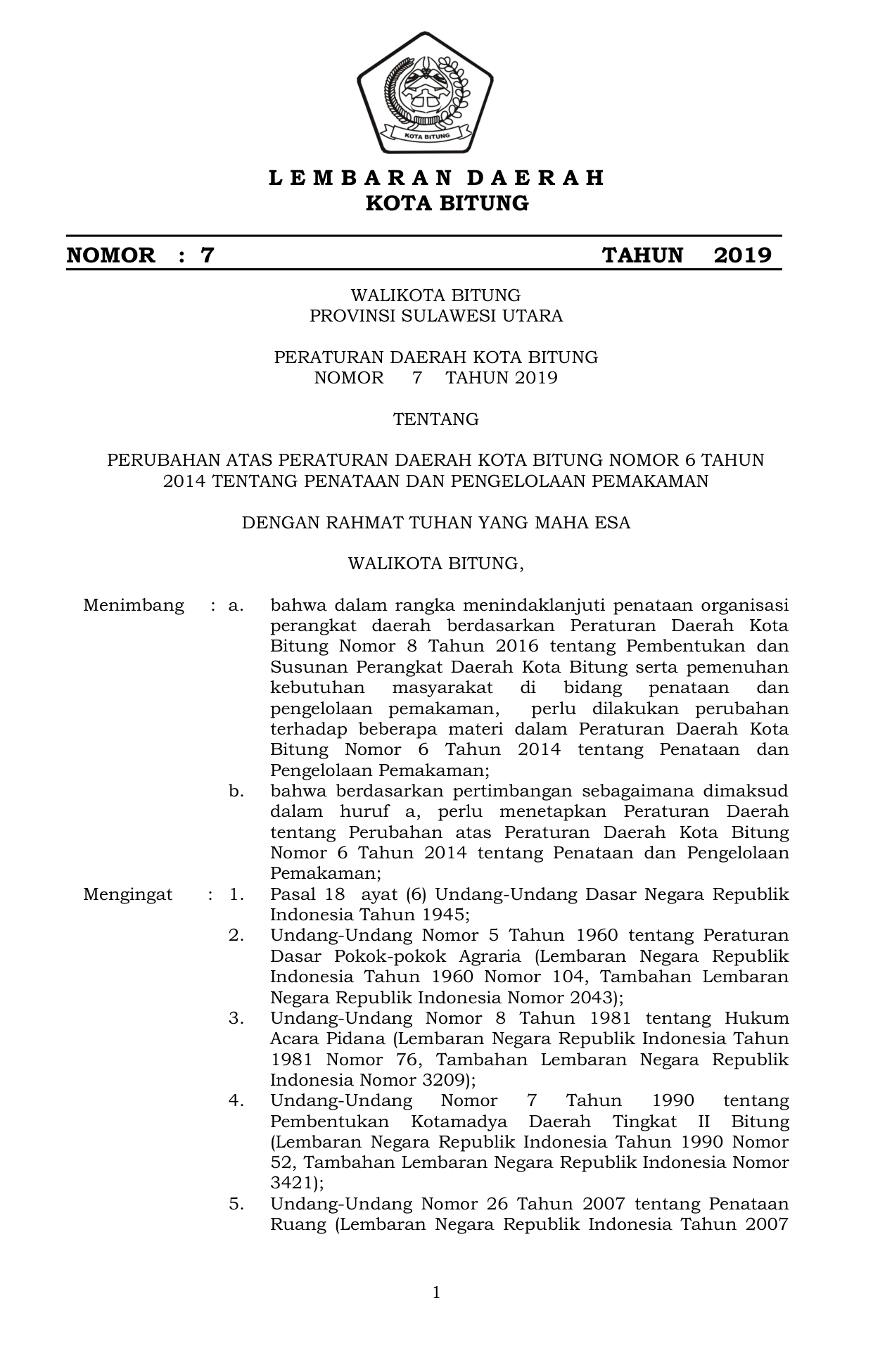 LEMBARAN DAERAH KOTA BITUNG TAHUN 2019 NOMOR 7