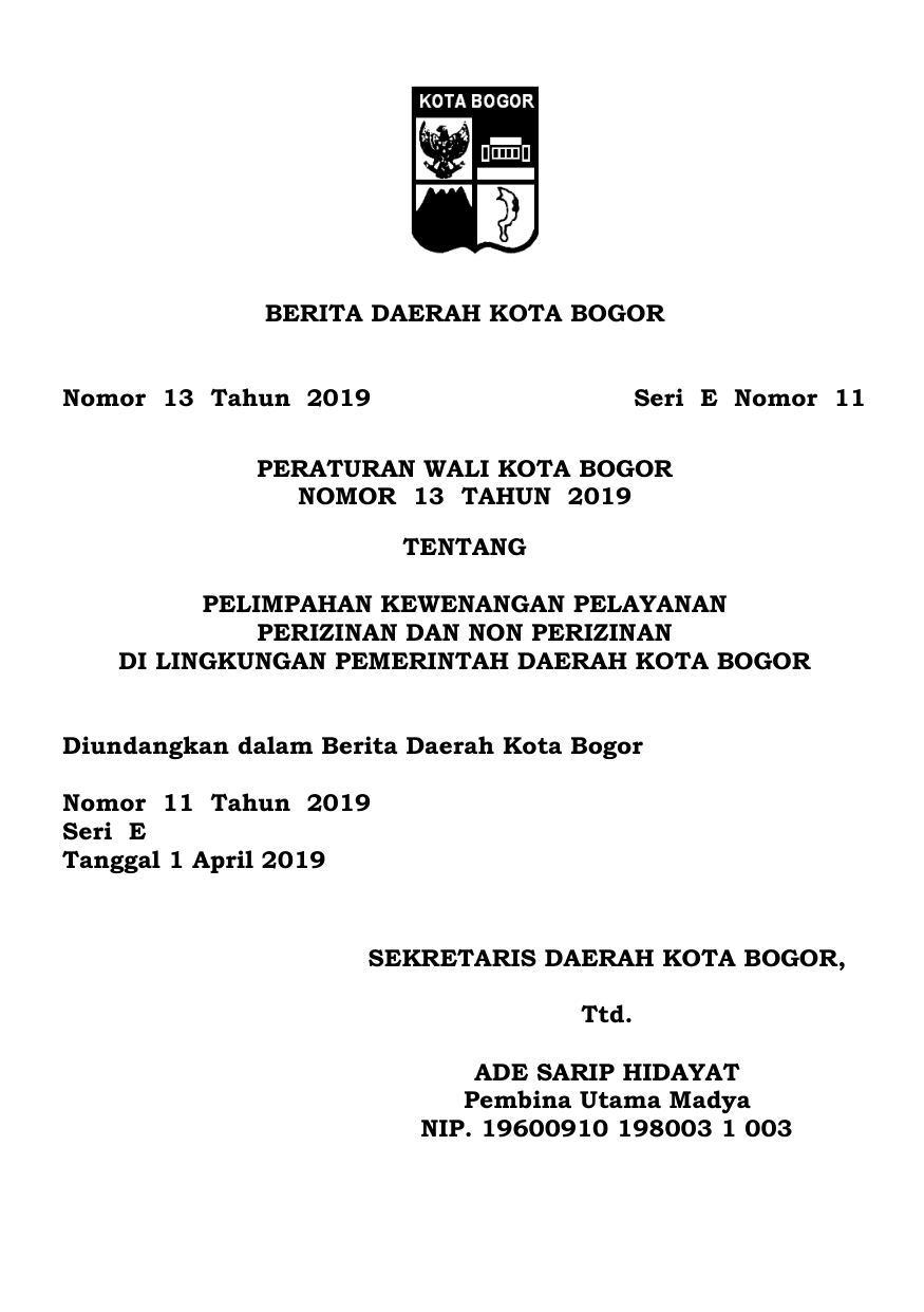 PERDA Nomor 13 Tahun 2019 | Peraturan Daerah Nomor 13 Tahun 2019 tentang PELIMPAHAN KEWENANGAN PELAYANAN PERIZINAN DAN NON PERIZINAN DI LINGKUNGAN PEMERINTAH DAERAH KOTA BOGOR