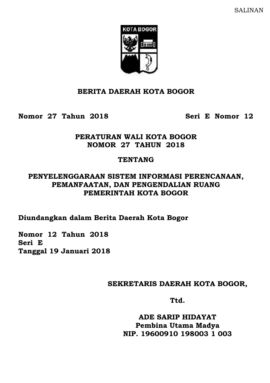 PERDA Nomor 27 Tahun 2018 | Peraturan Daerah Nomor 27 Tahun 2018 tentang PENYELENGGARAAN SISTEM INFORMASI PERENCANAAN, PEMANFAATAN, DAN PENGENDALIAN RUANG PEMERINTAH KOTA BOGOR