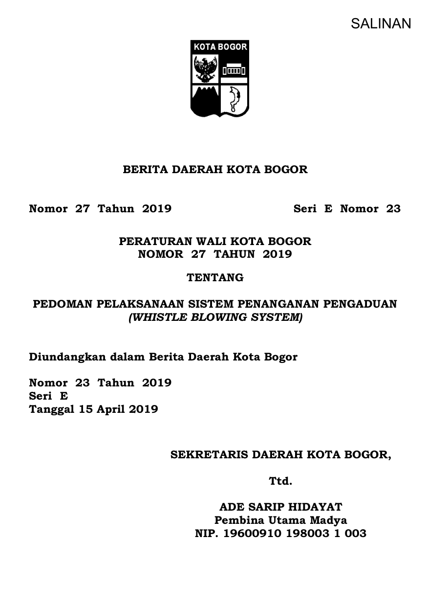 PERDA Nomor 27 Tahun 2019 | Peraturan Daerah Nomor 27 Tahun 2019 tentang PEDOMAN PELAKSANAAN SISTEM PENANGANAN PENGADUAN (WHISTLE BLOWING SYSTEM)