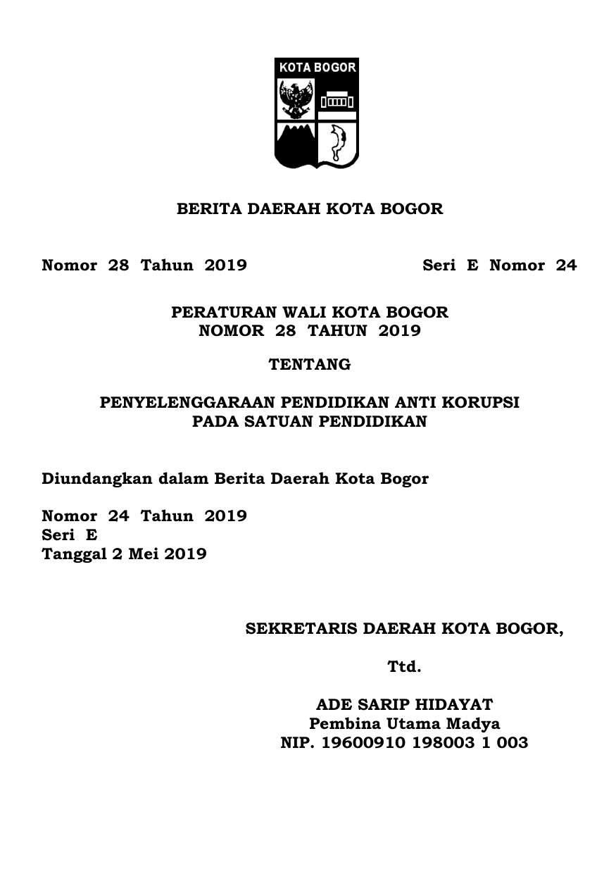 PERDA Nomor 28 Tahun 2019 | Peraturan Daerah Nomor 28 Tahun 2019 tentang PENYELENGGARAAN PENDIDIKAN ANTI KORUPSI PADA SATUAN PENDIDIKAN