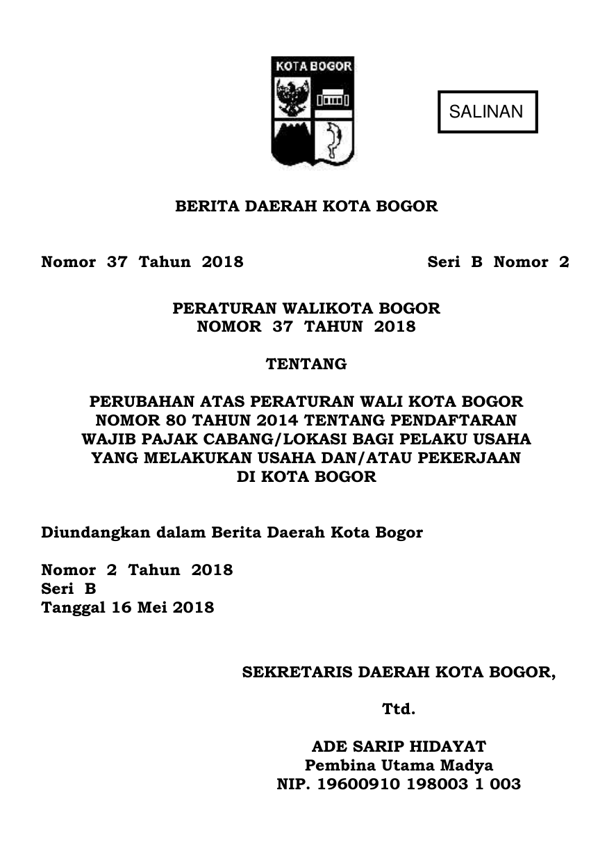 PERDA Nomor 37 Tahun 2018 | Peraturan Daerah Nomor 37 Tahun 2018 tentang PERUBAHAN ATAS PERATURAN WALI KOTA BOGOR NOMOR 80 TAHUN 2014 TENTANG PENDAFTARAN WAJIB PAJAK CABANG/LOKASI BAGI PELAKU USAHA YANG MELAKUKAN USAHA DAN/ATAU PEKERJAAN DI KOTA BOGOR