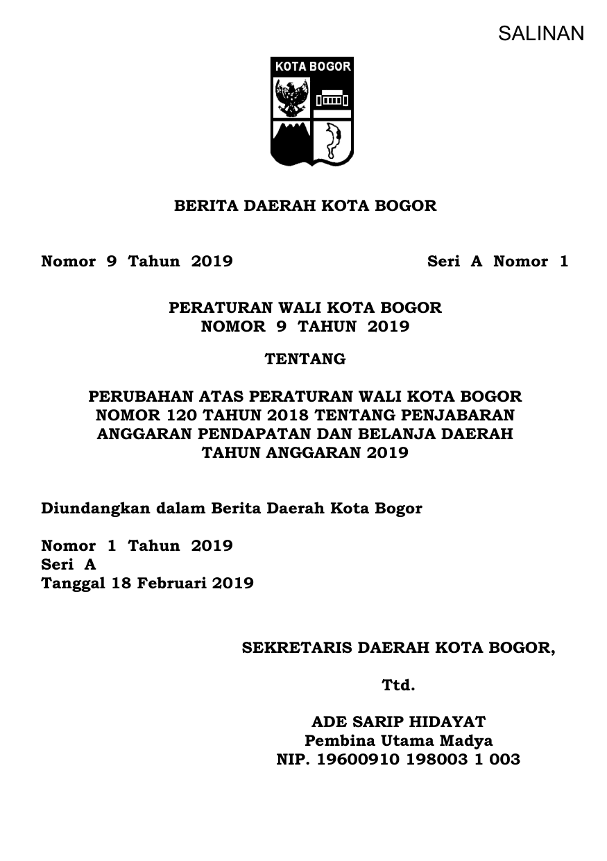 PERDA Nomor 9 Tahun 2019 | Peraturan Daerah Nomor 9 Tahun 2019 tentang PERUBAHAN ATAS PERATURAN WALI KOTA BOGOR NOMOR 120 TAHUN 2018 TENTANG PENJABARAN ANGGARAN PENDAPATAN DAN BELANJA DAERAH TAHUN ANGGARAN 2019