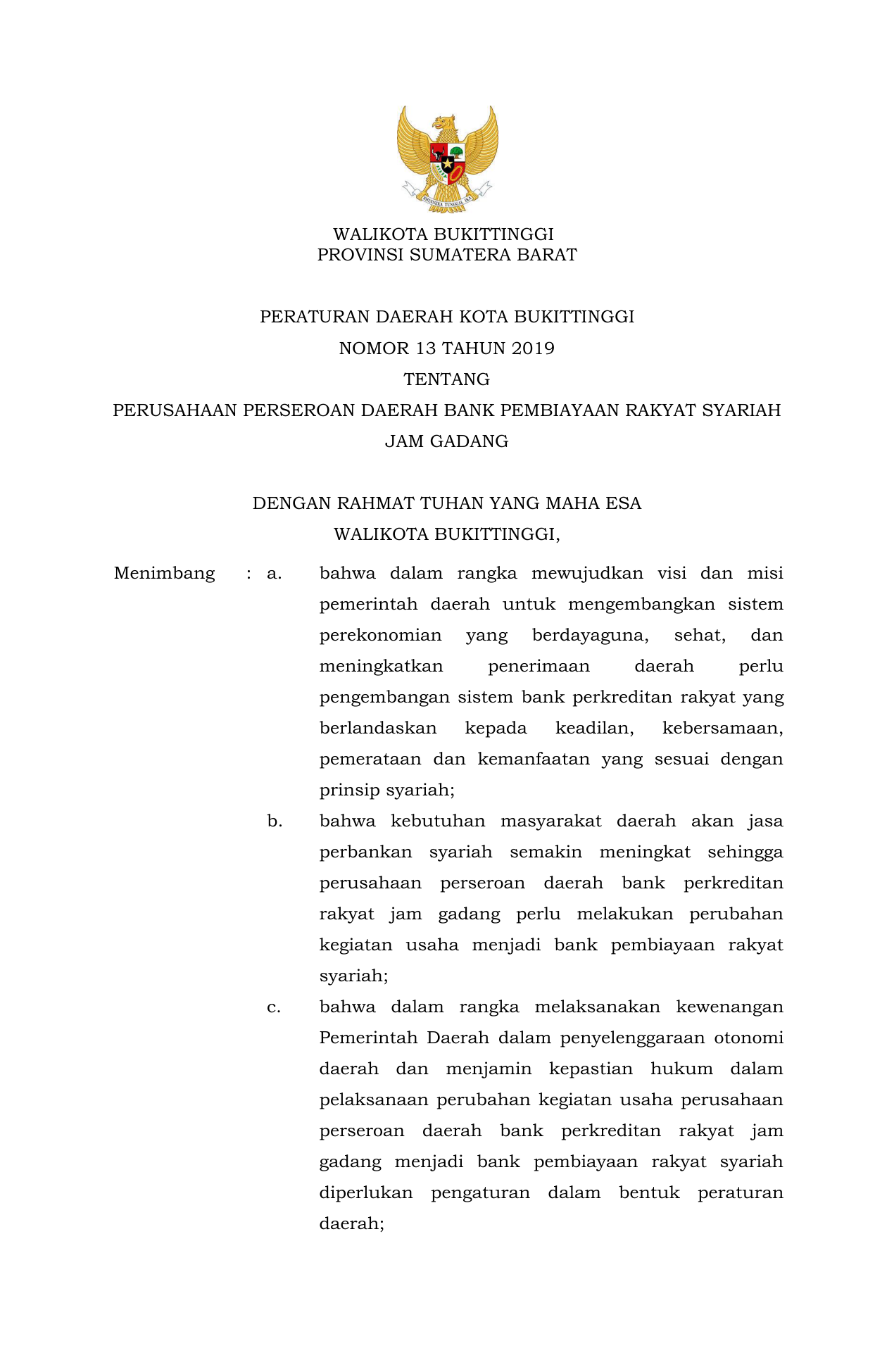 PERDA Nomor 13 Tahun 2019 | Peraturan Daerah Nomor 13 Tahun 2019 tentang PERATURAN DAERAH KOTA BUKITTINGGI NOMOR 13 TAHUN 2019 TENTANG PERUSAHAAN PERSEROAN DAERAH BANK PEMBIAYAAN RAKYAT SYARIAH JAM GADANG