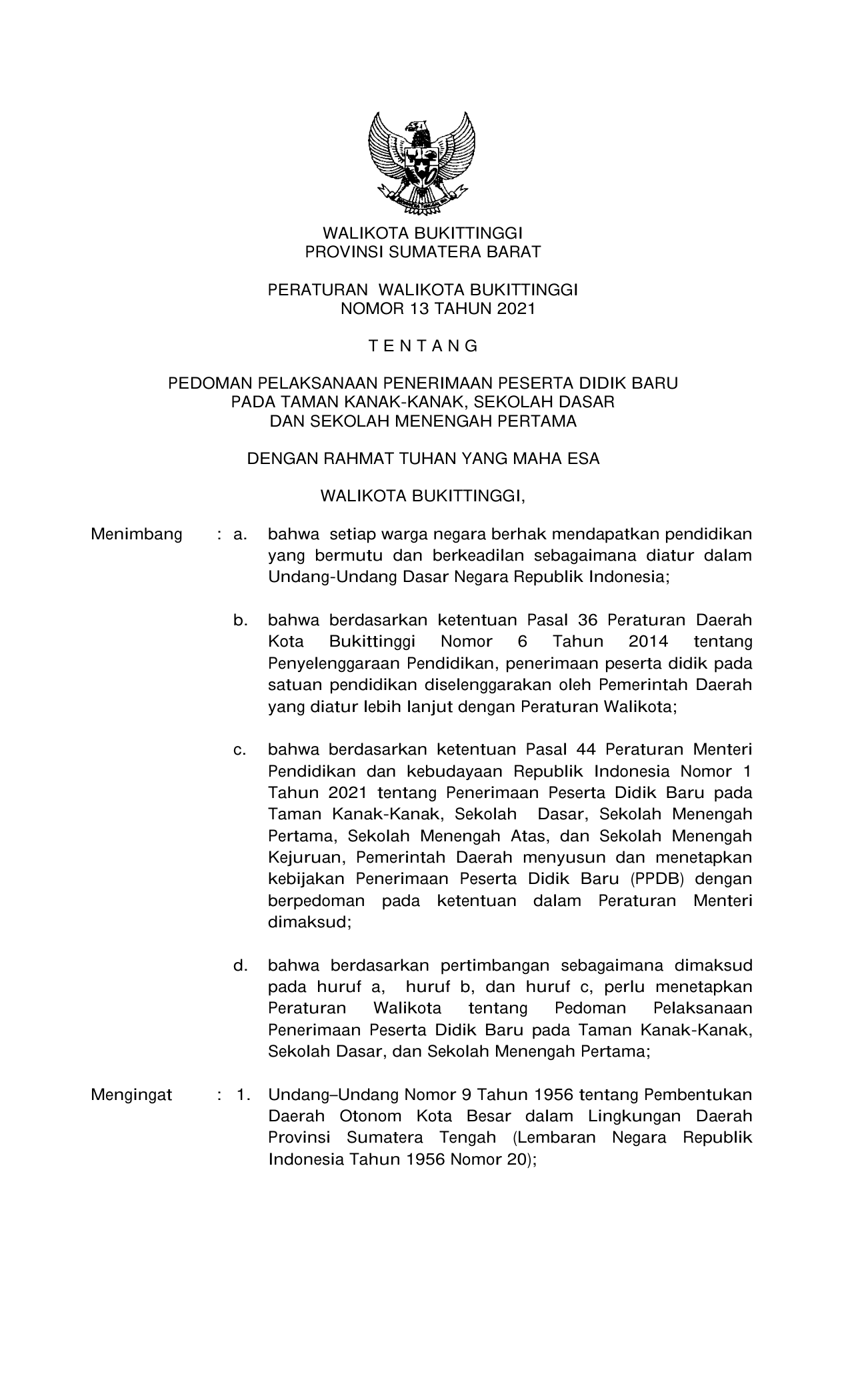 PERDA Nomor 13 Tahun 2021 | Peraturan Daerah Nomor 13 Tahun 2021 tentang PERATURAN WALIKOTA BUKITTINGGI NOMOR 13 TAHUN 2021 TENTANG PEDOMAN PELAKSANAAN PENERIMAAN PESERTA DIDIK BARUPADA TAMAN KANAK-KANAK, SEKOLAH DASAR DAN SEKOLAH MENENGAH PERTAMA
