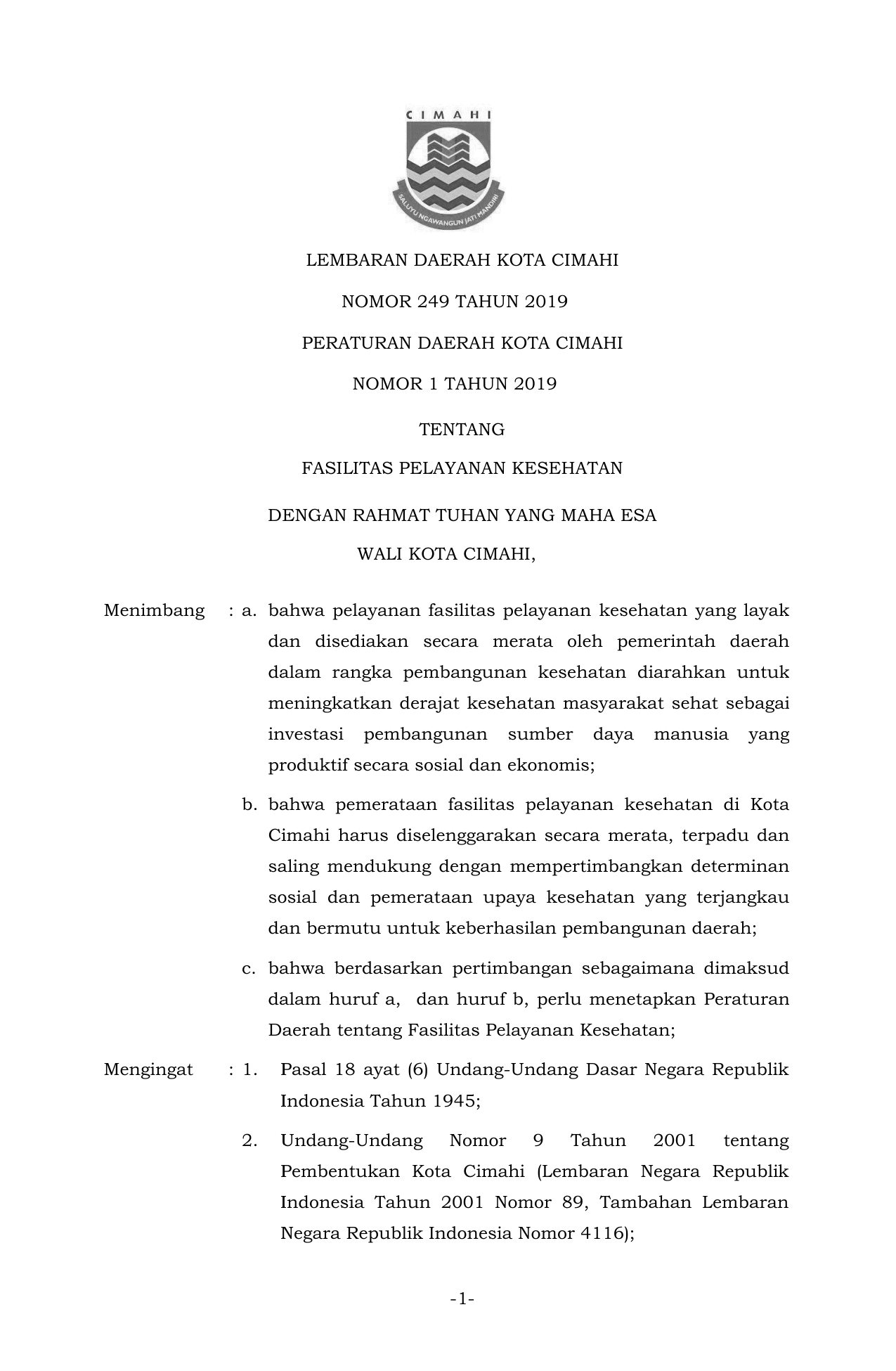 PERDA Nomor 1 Tahun 2019 | Peraturan Daerah Nomor 1 Tahun 2019 tentang Fasilitas Pelayanan Kesehatan