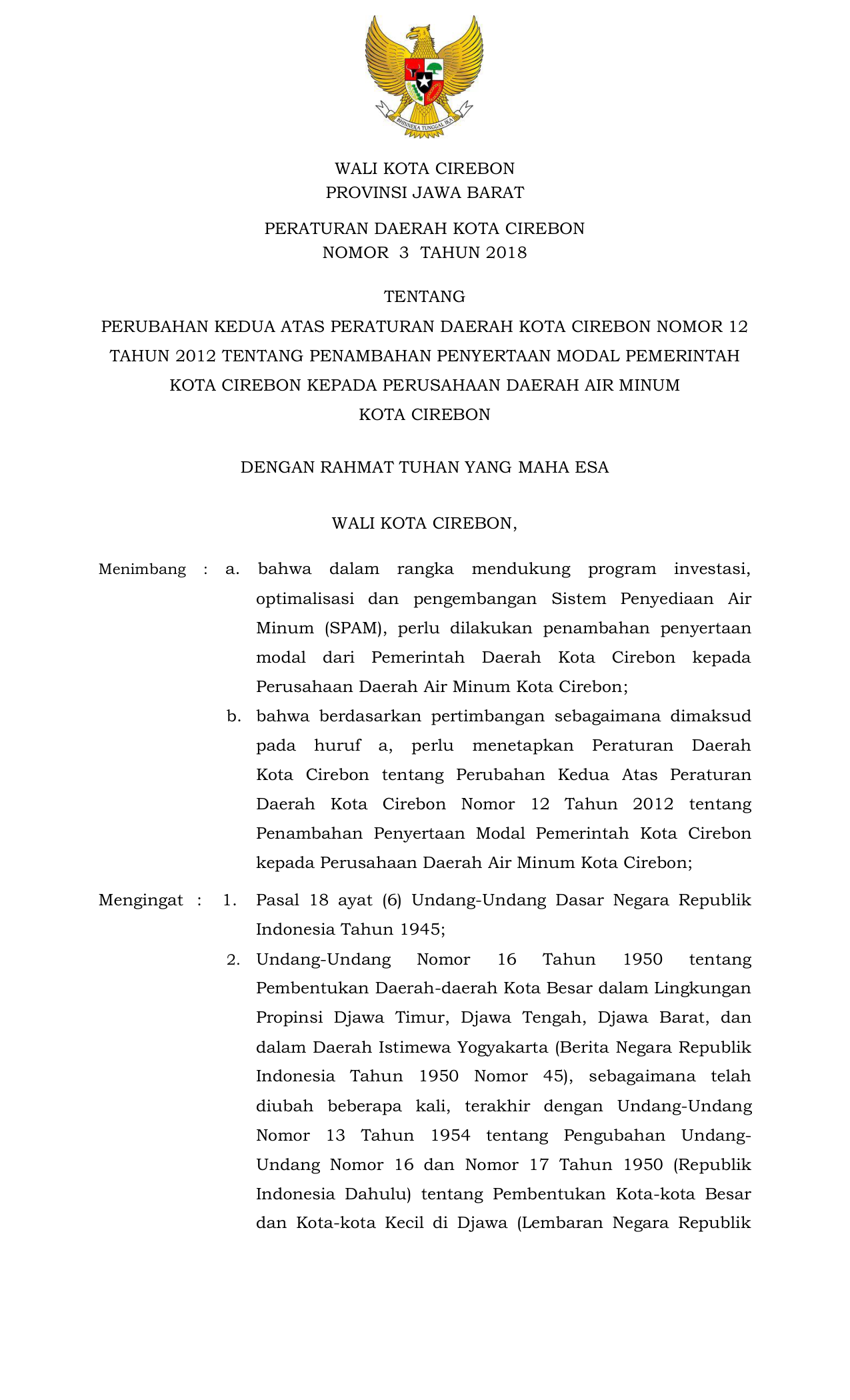 PERDA Nomor 3 Tahun 2018 | Peraturan Daerah Nomor 3 Tahun 2018 tentang PERUBAHAN KEDUA ATAS PERATURAN DAERAH KOTA CIREBON NOMOR 12TAHUN 2012 TENTANG PENAMBAHAN PENYERTAAN MODAL PEMERINTAHKOTA CIREBON KEPADA PERUSAHAAN DAERAH AIR MINUMKOTA CIREBON