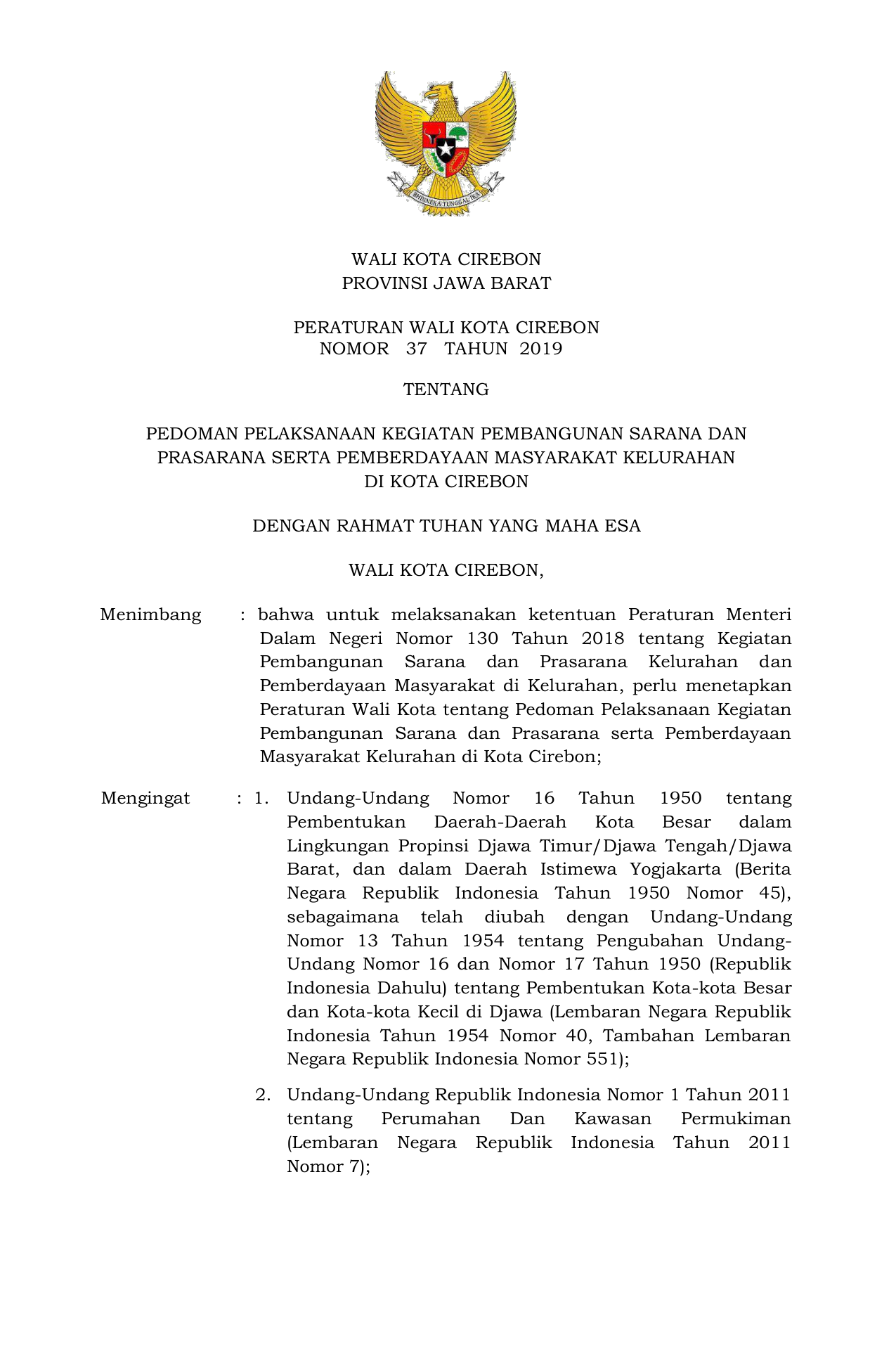 PERDA Nomor 37 Tahun 2019 | Peraturan Daerah Nomor 37 Tahun 2019 tentang PEDOMAN PELAKSANAAN KEGIATAN PEMBANGUNAN SARANA DAN PRASARANA SERTA PEMBERDAYAAN MASYARAKAT KELURAHAN DI KOTA CIREBON
