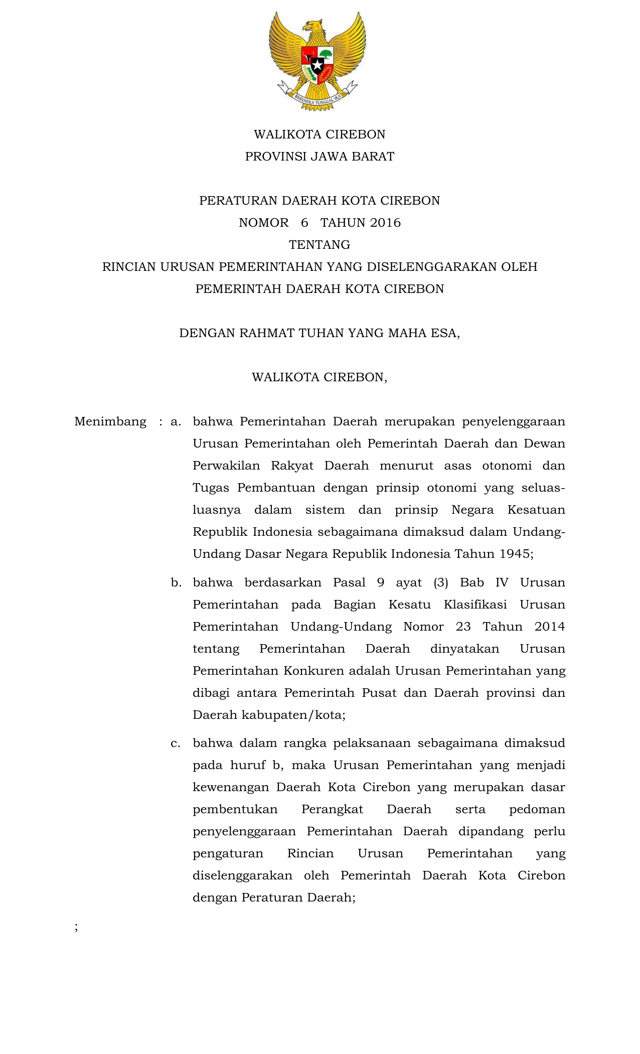 PERDA Nomor 6 Tahun 2016 | Peraturan Daerah Nomor 6 Tahun 2016 tentang RINCIAN URUSAN PEMERINTAHAN YANG DISELENGGARAKAN OLEHPEMERINTAH DAERAH KOTA CIREBON