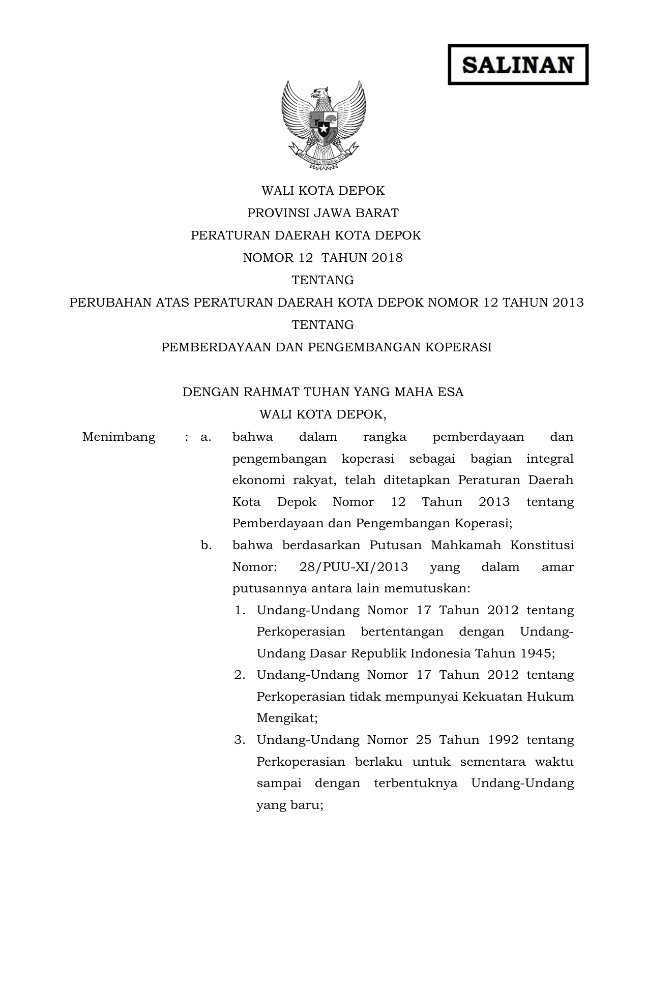 PERDA Nomor 12 Tahun 2018 | Peraturan Daerah Nomor 12 Tahun 2018 tentang PERUBAHAN ATAS PERATURAN DAERAH KOTA DEPOK NOMOR 12 TAHUN 2013
