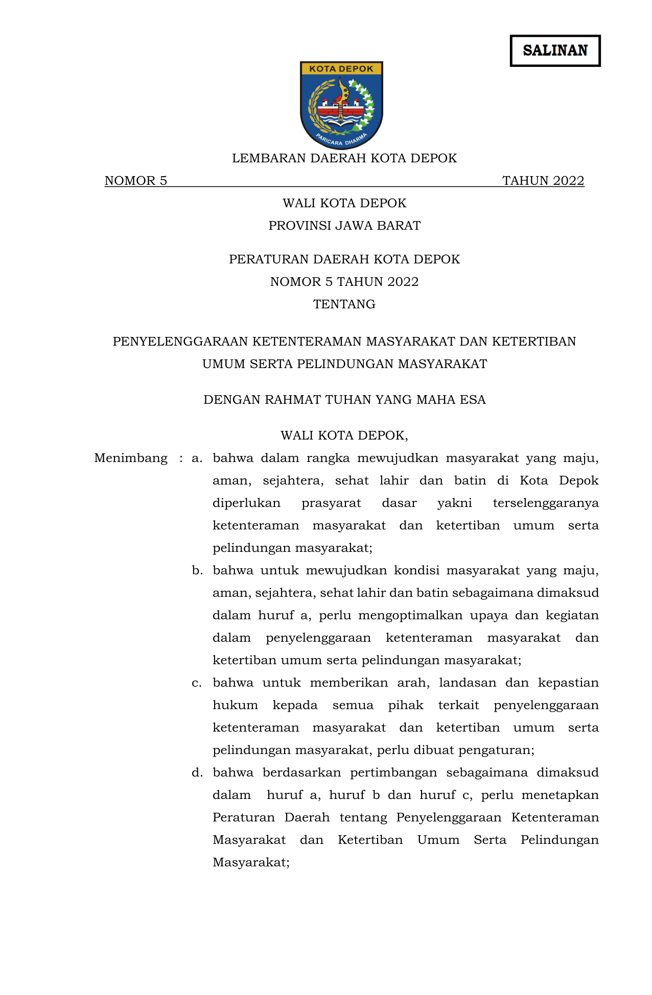 PERDA Nomor 5 Tahun 2022 | Peraturan Daerah Nomor 5 Tahun 2022 tentang PENYELENGGARAAN KETENTERAMAN MASYARAKAT DAN KETERTIBAN UMUM SERTA PELINDUNGAN MASYARAKAT