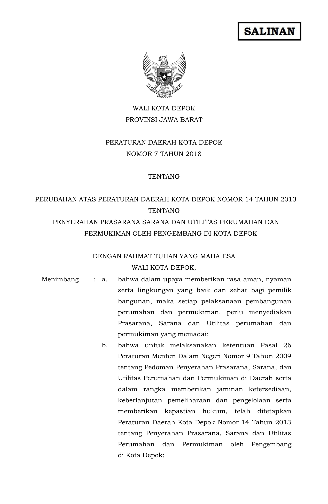 PERDA Nomor 7 Tahun 2018 | Peraturan Daerah Nomor 7 Tahun 2018 tentang PERUBAHAN ATAS PERATURAN DAERAH KOTA DEPOK NOMOR 14 TAHUN 2013 TENTANG PENYERAHAN PRASARANA SARANA DAN UTILITAS PERUMAHAN DAN PERMUKIMAN OLEH PENGEMBANG DI KOTA DEPOK
