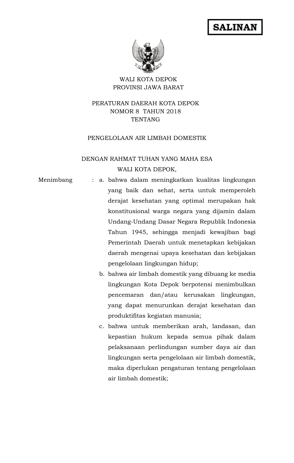 PERDA Nomor 8 Tahun 2018 | Peraturan Daerah Nomor 8 Tahun 2018 tentang PENGELOLAAN AIR LIMBAH DOMESTIK
