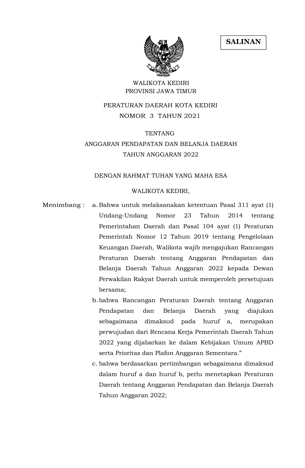 PERDA Nomor 3 Tahun 2021 | Peraturan Daerah Nomor 3 Tahun 2021 tentang ANGGARAN PENDAPATAN DAN BELANJA DAERAH TAHUN ANGGARAN 2022