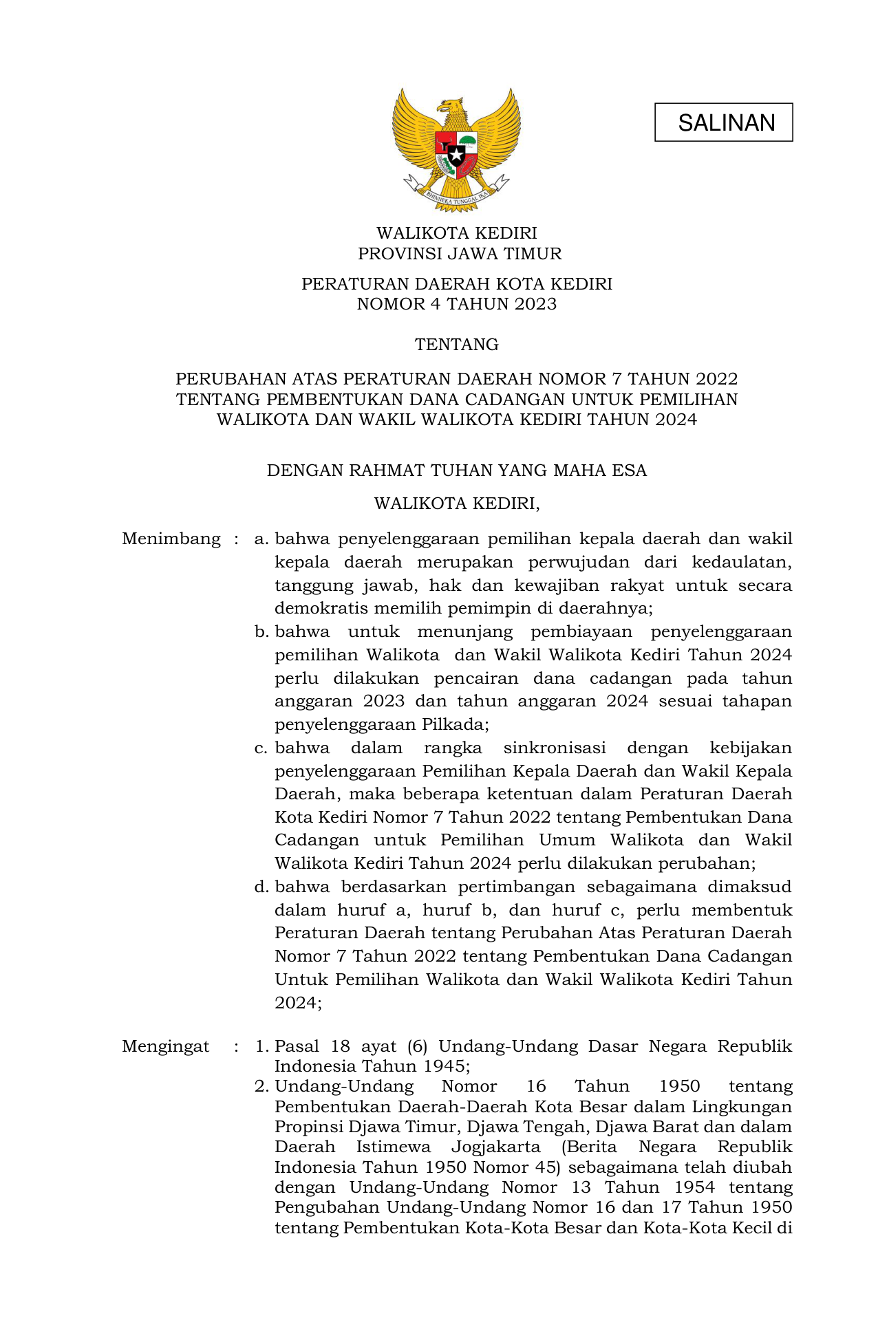 PERDA Nomor 4 Tahun 2023 | Peraturan Daerah Nomor 4 Tahun 2023 tentang PERUBAHAN ATAS PERATURAN DAERAH NOMOR 7 TAHUN 2022 TENTANG PEMBENTUKAN DANA CADANGAN UNTUK PEMILIHAN WALIKOTA DAN WAKIL WALIKOTA KEDIRI TAHUN 2024