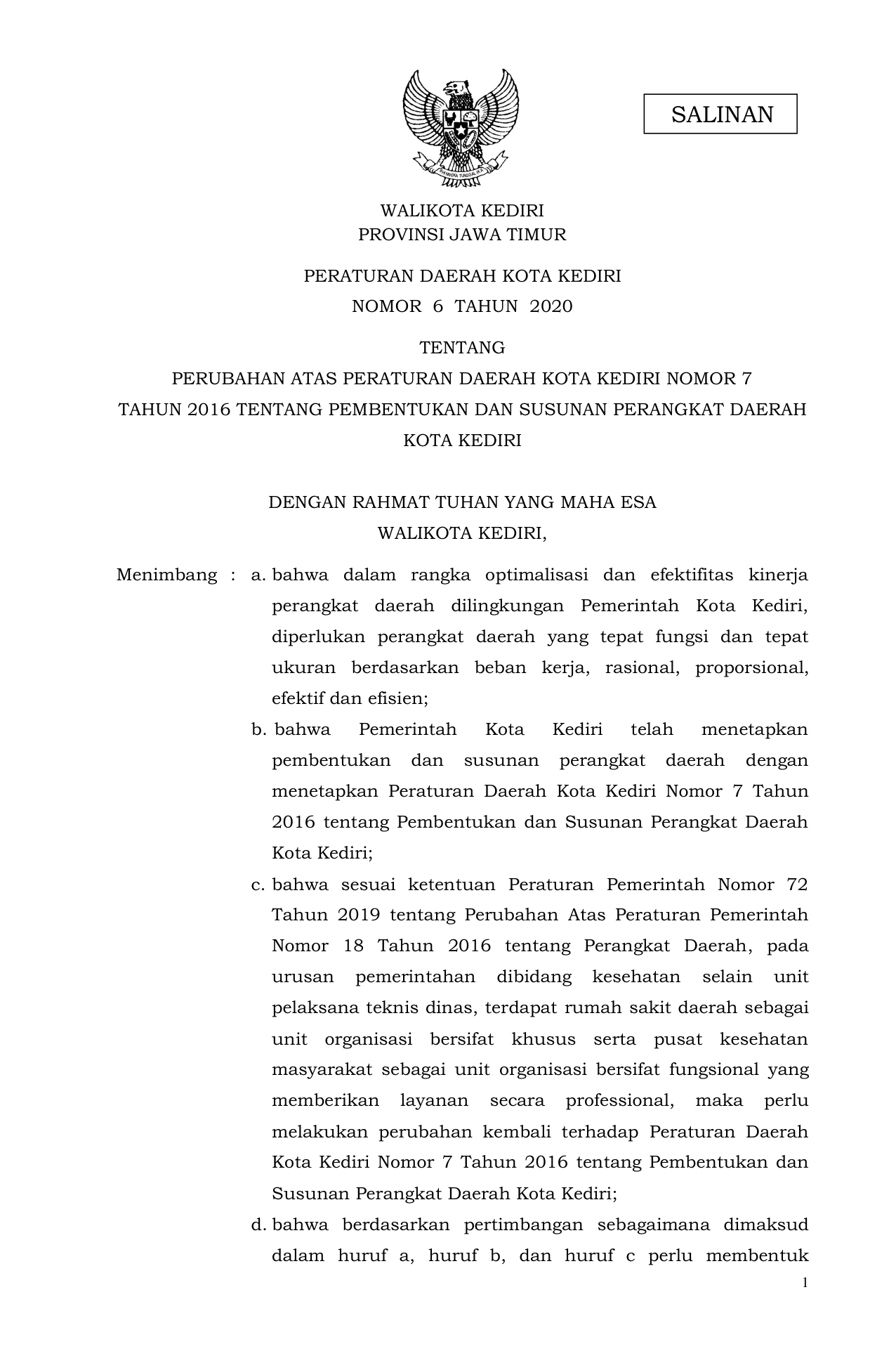 PERDA Nomor 6 Tahun 2020 | Peraturan Daerah Nomor 6 Tahun 2020 tentang PERUBAHAN ATAS PERATURAN DAERAH KOTA KEDIRI NOMOR 7 TAHUN 2016 TENTANG PEMBENTUKAN DAN SUSUNAN PERANGKAT DAERAH KOTA KEDIRI