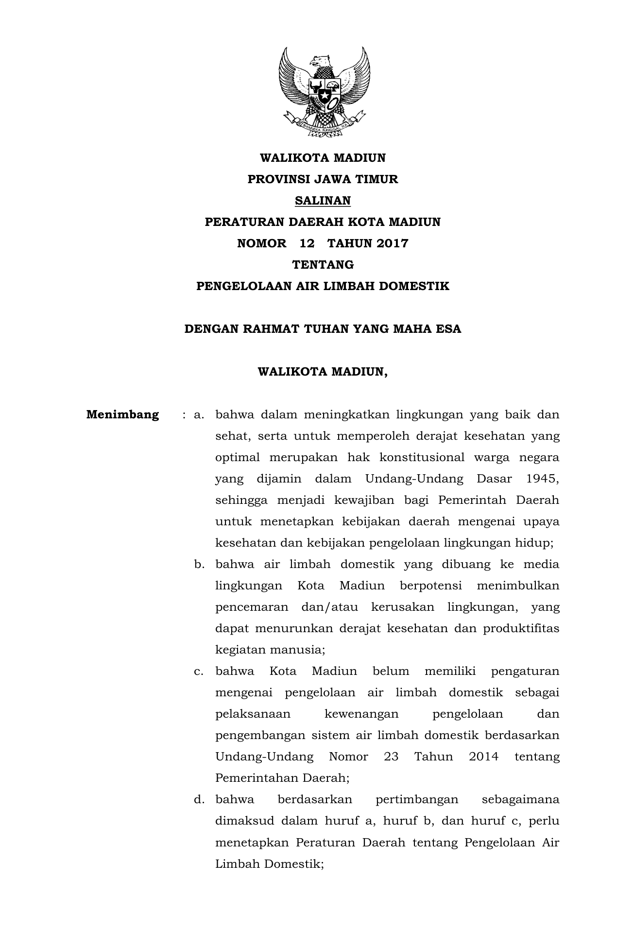 PERDA Nomor 12 Tahun 2017 | Peraturan Daerah Nomor 12 Tahun 2017 tentang Pengelolaan Air Limbah Domestik