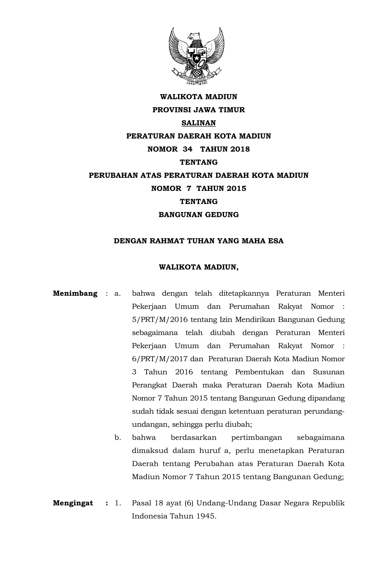 PERDA Nomor 34 Tahun 2018 | Peraturan Daerah Nomor 34 Tahun 2018 tentang Perubahan Atas Peraturan Daerah Kota Madiun Nomor 7 Tahun 2015 Tentang Bangunan Gedung