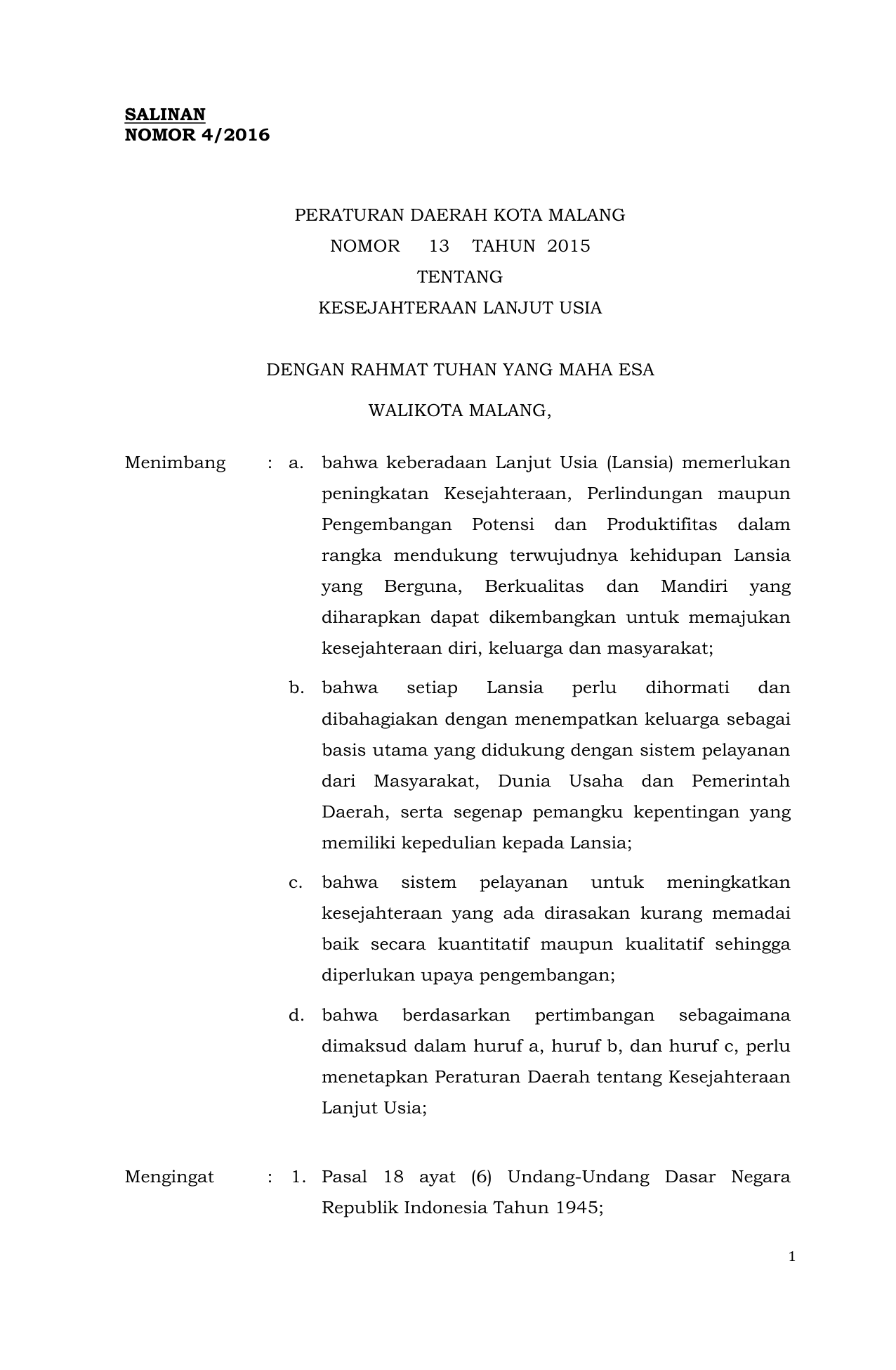 PERDA Nomor 13 Tahun 2015 | Peraturan Daerah Nomor 13 Tahun 2015 tentang KESEJAHTERAAN LANJUT USIA