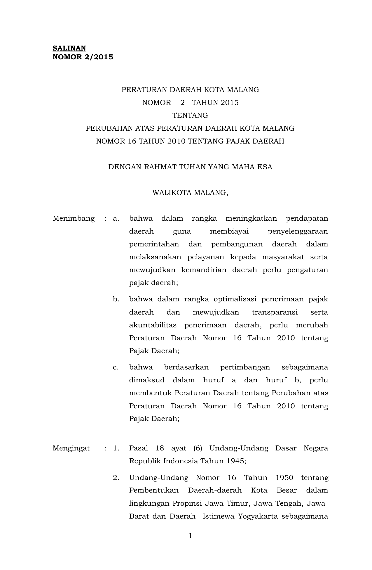 PERDA Nomor 2 Tahun 2015 | Peraturan Daerah Nomor 2 Tahun 2015 tentang PERUBAHAN ATAS PERATURAN DAERAH KOTA MALANGNOMOR 16 TAHUN 2010 TENTANG PAJAK DAERAH