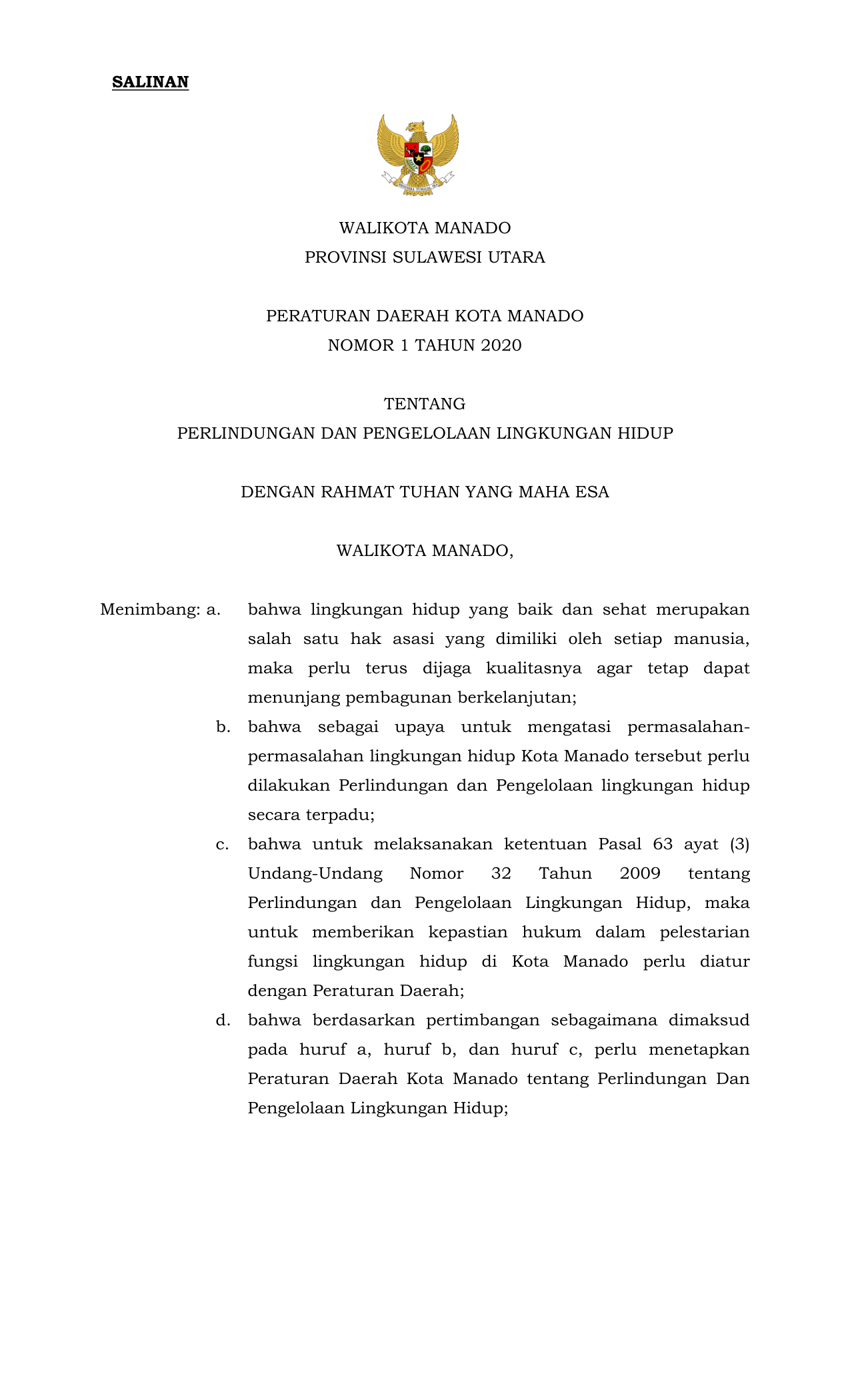 PERDA Nomor 1 Tahun 2020 | Peraturan Daerah Nomor 1 Tahun 2020 tentang Peraturan Daerah Kota Manado Nomor 1 Tahun 2020 Tentang Perlindungan Dan Pengelolaan Lingkungan Hidup