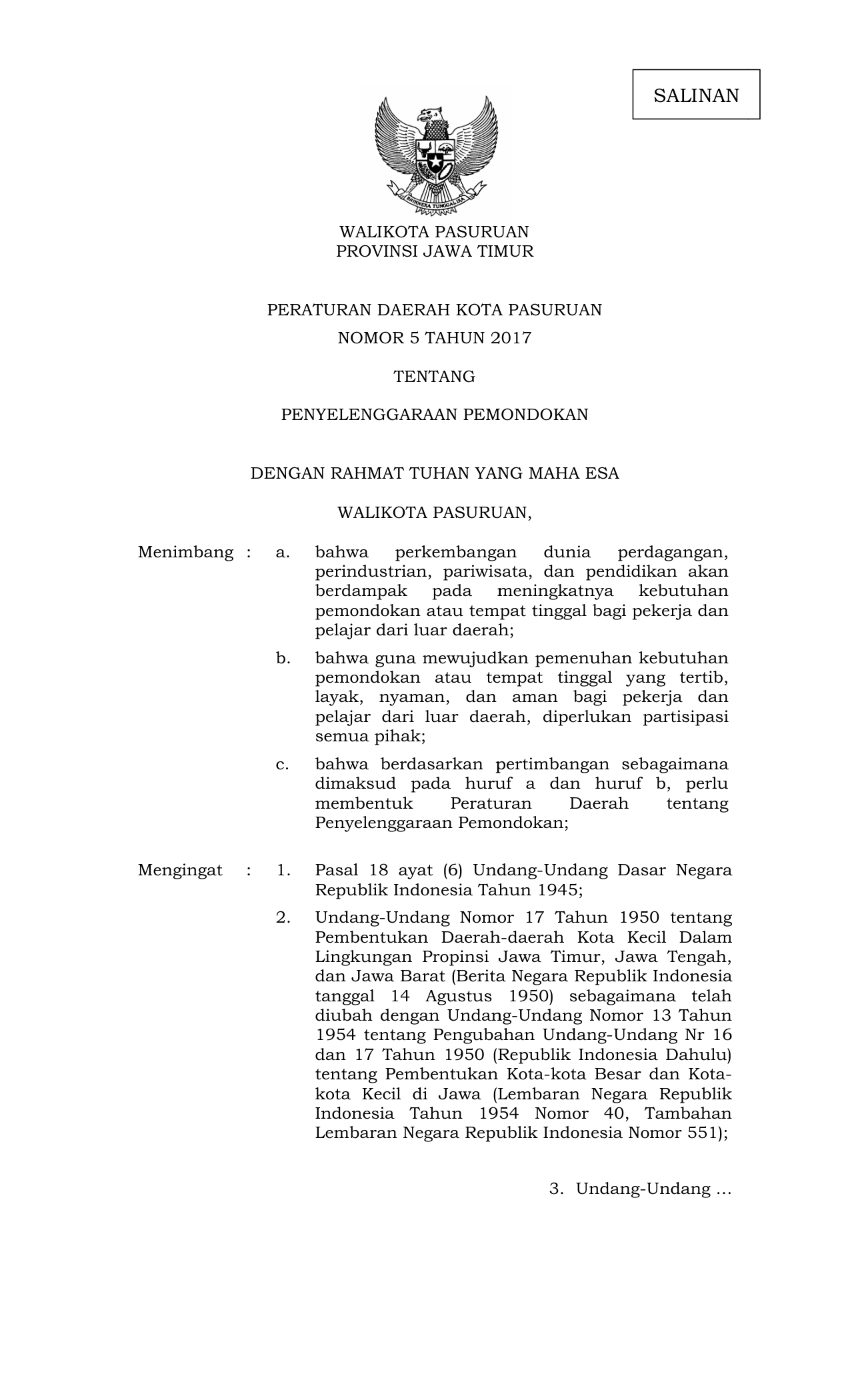 PERDA Nomor 5 Tahun 2017 | Peraturan Daerah Nomor 5 Tahun 2017 tentang PERATURAN DAERAH KOTA PASURUAN NOMOR 5 TAHUN 2017 TENTANG PENYELENGGARAAN PEMONDOKAN