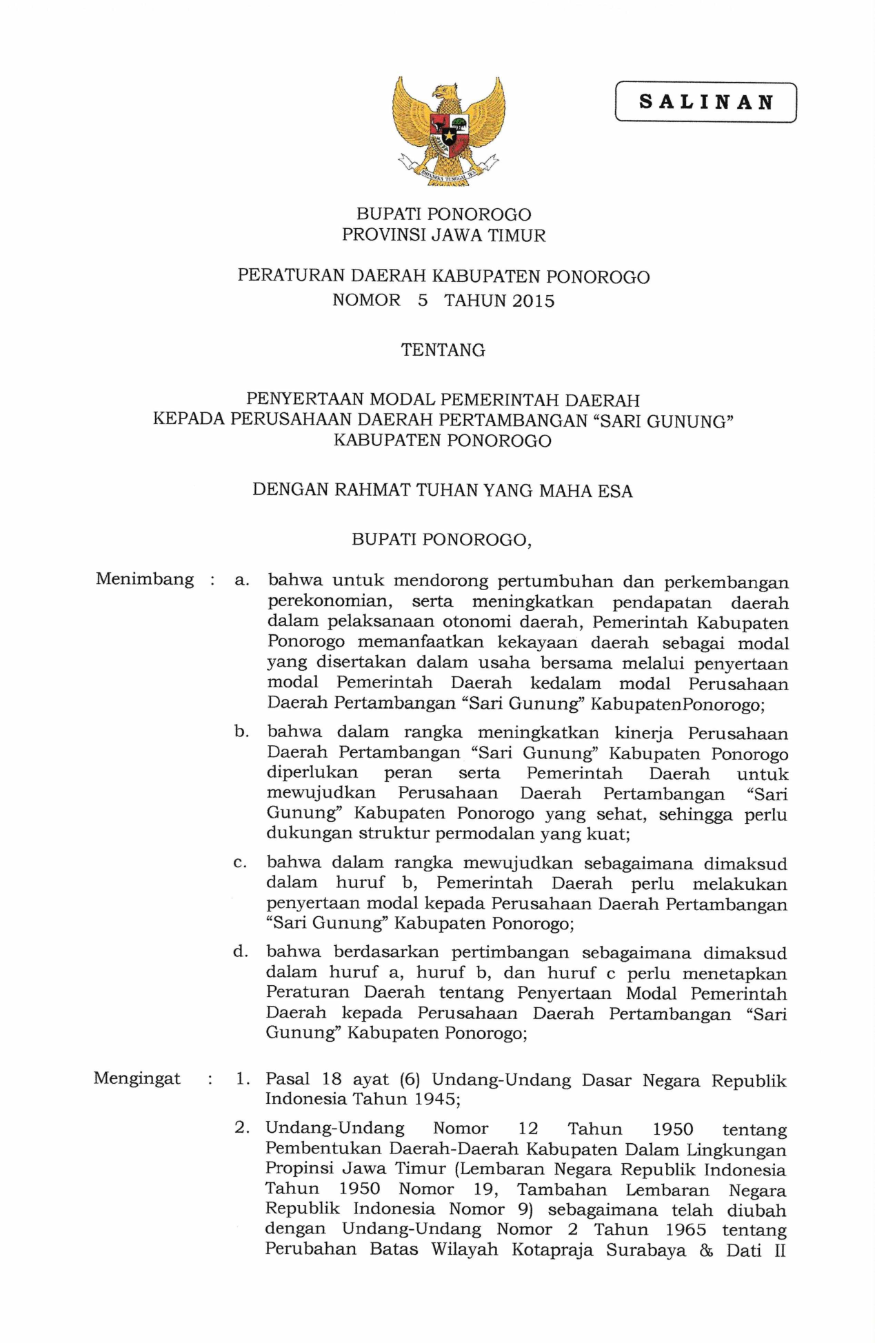 PERDA Nomor 5 Tahun 2015 | Peraturan Daerah Nomor 5 Tahun 2015 tentang PENYERTAAN MODAL PEMERINTAH DAERAH KEPADA PERUSAHAAN DAERAH PERTAMBANGAN "SARI GUNUNG" KABUPATEN PONOROGO