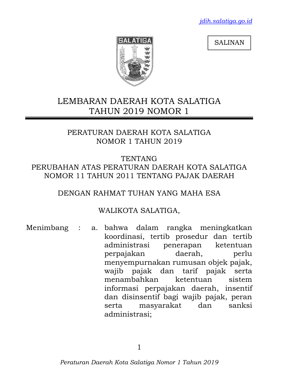 Peraturan Daerah Kota Salatiga Nomor 1 Tahun 2019