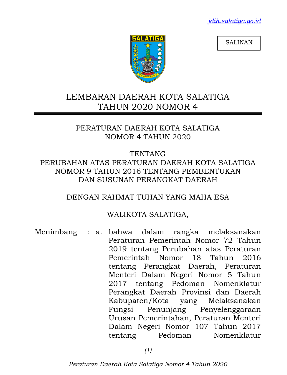 PERDA Nomor 4 Tahun 2020 | Peraturan Daerah Nomor 4 Tahun 2020 tentang Perubahan Atas Peraturan Daerah Kota Salatiga Nomor 9 Tahun 2016 tentang Pembentukan dan Susunan Perangkat Daerah