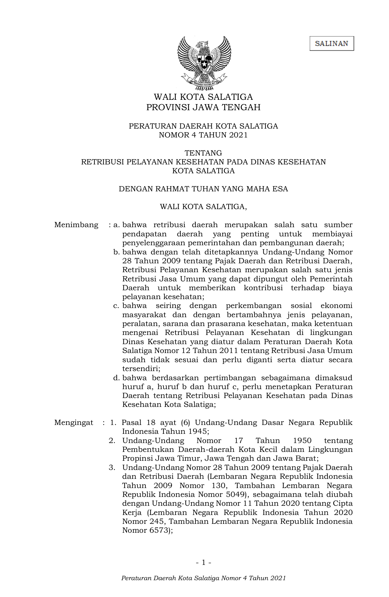 PERDA Nomor 4 Tahun 2021 | Peraturan Daerah Nomor 4 Tahun 2021 tentang Retribusi Pelayanan Kesehatan pada dinas Kesehatan Kota Salatiga