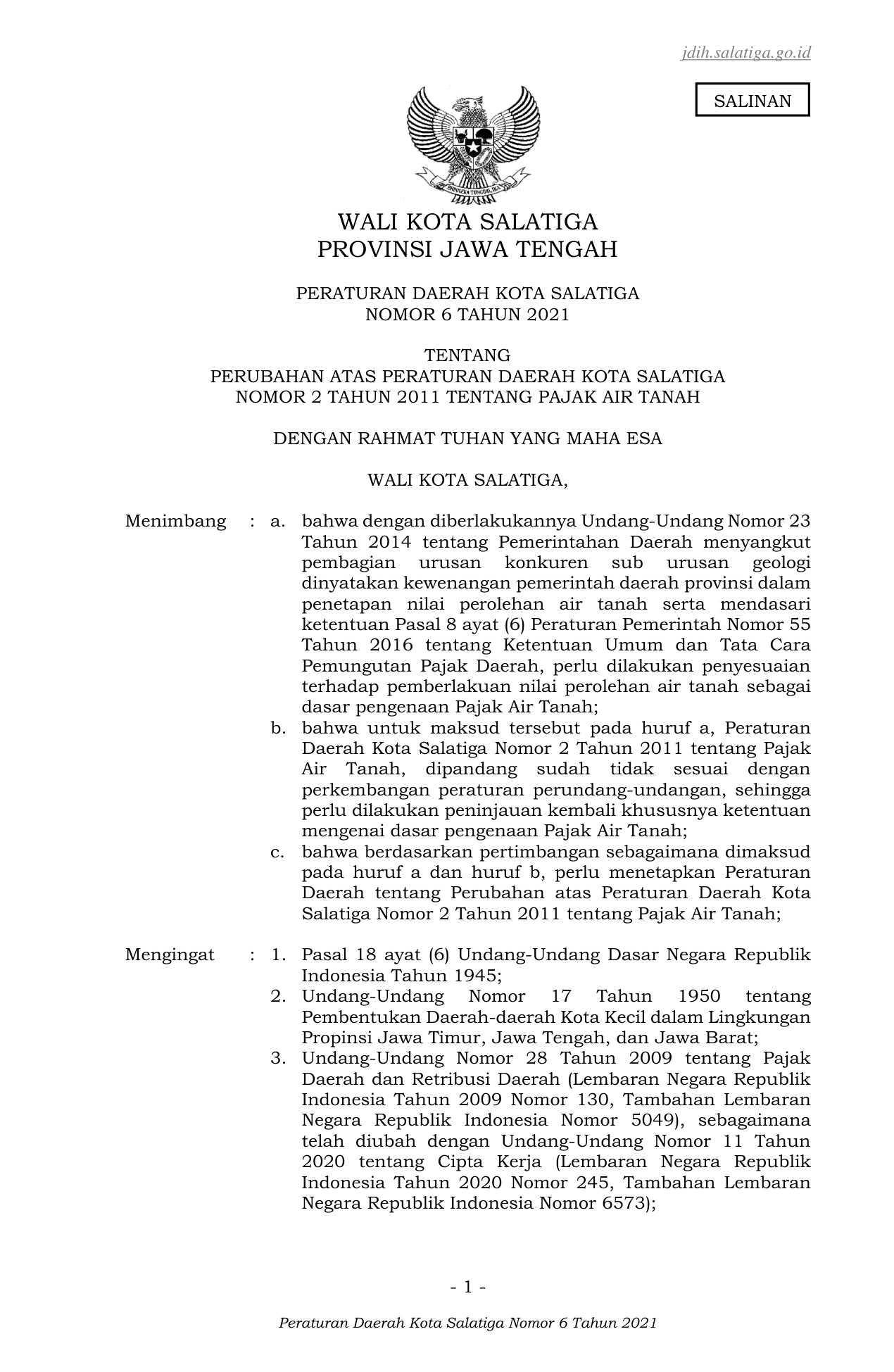 PERDA Nomor 6 Tahun 2021 | Peraturan Daerah Nomor 6 Tahun 2021 tentang Peraturan Daerah NOMOR 6 TAHUN 2021 TENTANG Perubahan Atas Peraturan Daerah Kota Salatiga Nomor 2 Tahun 2011 tentang Pajak Air Tanah