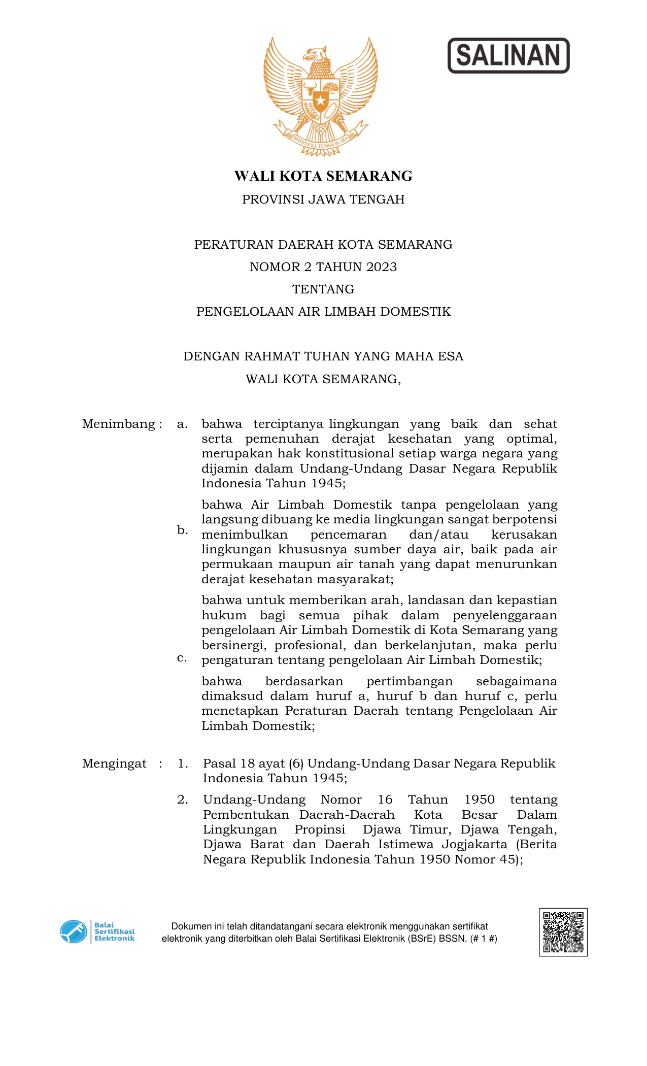 PERDA Nomor 2 Tahun 2023 | Peraturan Daerah Nomor 2 Tahun 2023 tentang PENGELOLAAN AIR LIMBAH DOMESTIK
