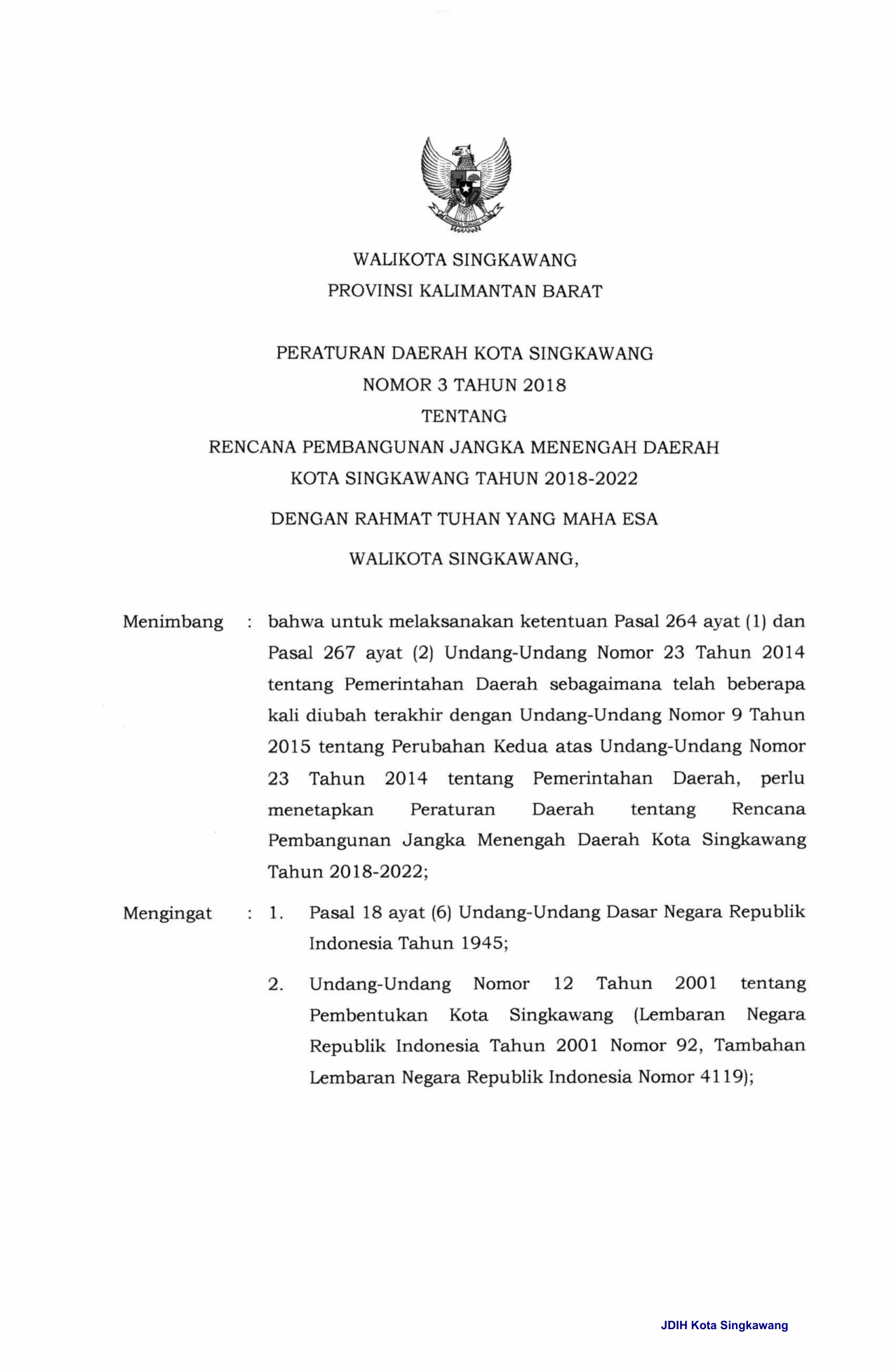 PERDA Nomor 3 Tahun 2018 | Peraturan Daerah Nomor 3 Tahun 2018 tentang Rencana Pembangunan Jangka Menengah Daerah Kota Singkawang Tahun 2018-2022