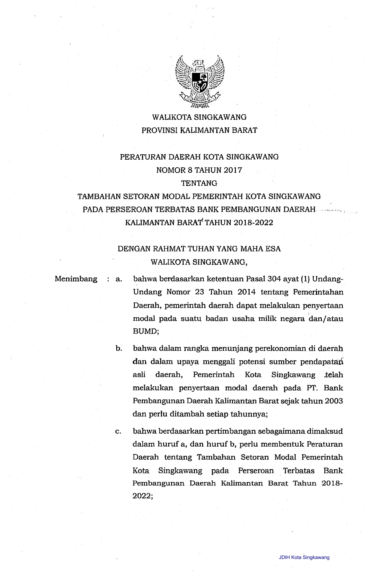 PERDA Nomor 8 Tahun 2017 | Peraturan Daerah Nomor 8 Tahun 2017 tentang Tambahan Setoran Modal Pemerintah Kota Singkawang pada Perseroan Terbatas Bank Pembangunan Daerah Kalimantan Barat Tahun 2018-2022
