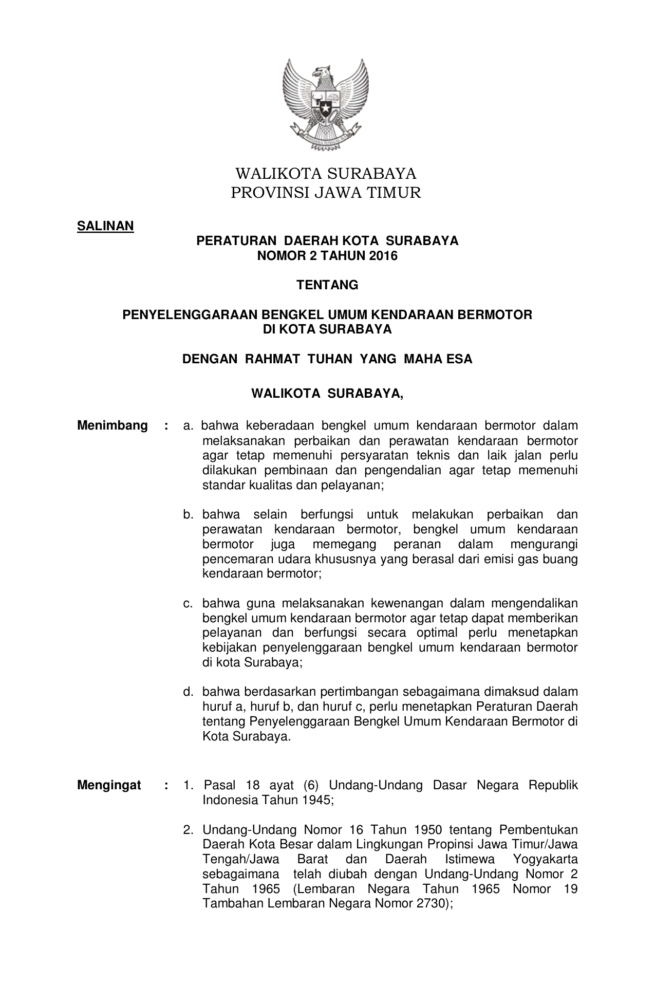 PERDA Nomor 2 Tahun 2016 | Peraturan Daerah Nomor 2 Tahun 2016 tentang PENYELENGGARAAN BENGKEL UMUM KENDARAAN BERMOTOR DI KOTA SURABAYA