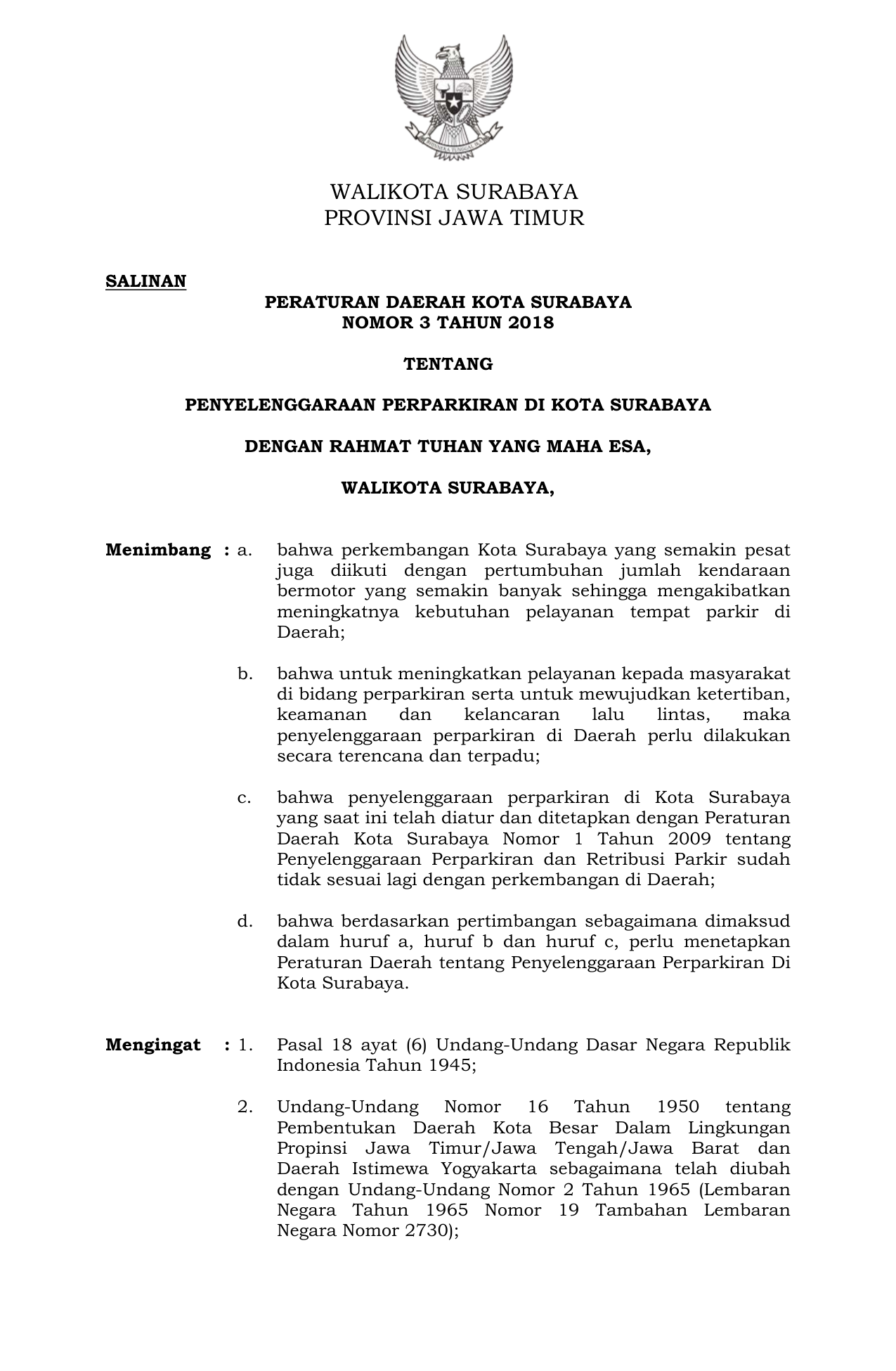 PERDA Nomor 3 Tahun 2018 | Peraturan Daerah Nomor 3 Tahun 2018 tentang PENYELENGGARAAN PERPARKIRAN DI KOTA SURABAYA