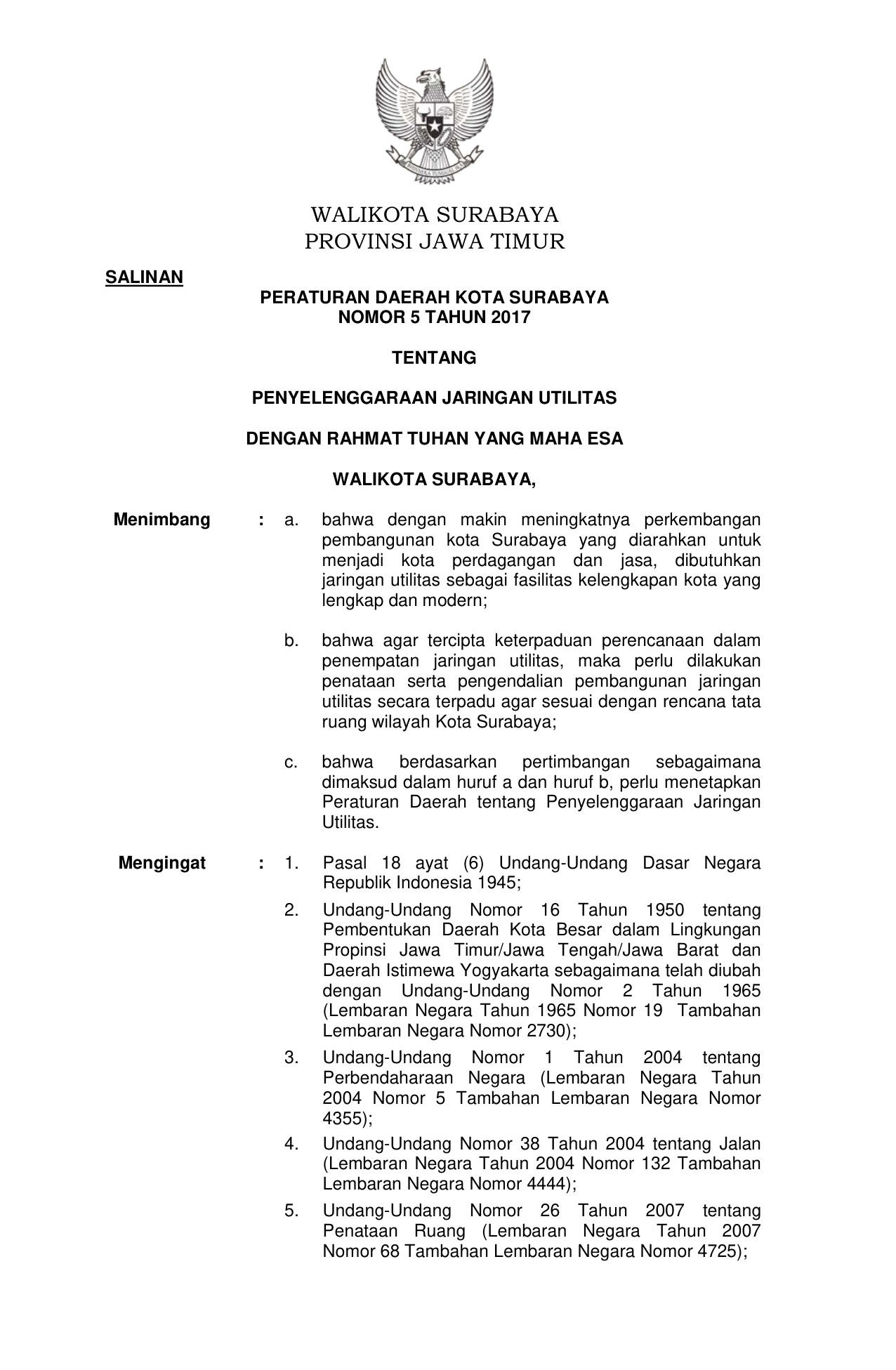 PERDA Nomor 5 Tahun 2017 | Peraturan Daerah Nomor 5 Tahun 2017 tentang PENYELENGGARAAN JARINGAN UTILITAS