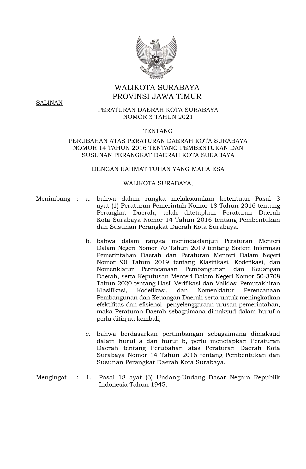 PERDA Nomor 5 Tahun 2021 | Peraturan Daerah Nomor 5 Tahun 2021 tentang PERUBAHAN ATAS PERATURAN DAERAH KOTA SURABAYA NOMOR 14 TAHUN 2016 TENTANG PEMBENTUKAN DAN SUSUNAN PERANGKAT DAERAH KOTA SURABAYA