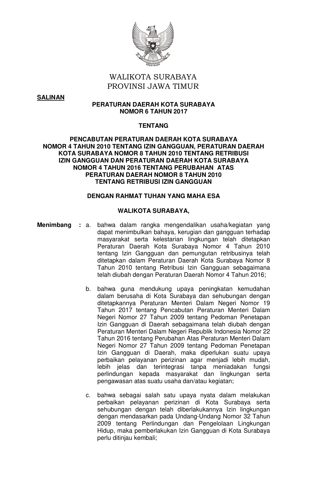 PERDA Nomor 6 Tahun 2017 | Peraturan Daerah Nomor 6 Tahun 2017 tentang PENCABUTAN PERATURAN DAERAH KOTA SURABAYANOMOR 4 TAHUN 2010 TENTANG IZIN GANGGUAN, PERATURAN DAERAHKOTA SURABAYA NOMOR 8 TAHUN 2010 TENTANG RETRIBUSIIZIN GANGGUAN DAN PERATURAN DAERAH KOTA SURABAYANOMOR 4 TAHUN 2016 TENTANG PERUBAHAN ATASPERATURAN DAERAH NOMOR 8 TAHUN 2010TENTANG RETRIBUSI IZIN GANGGUAN