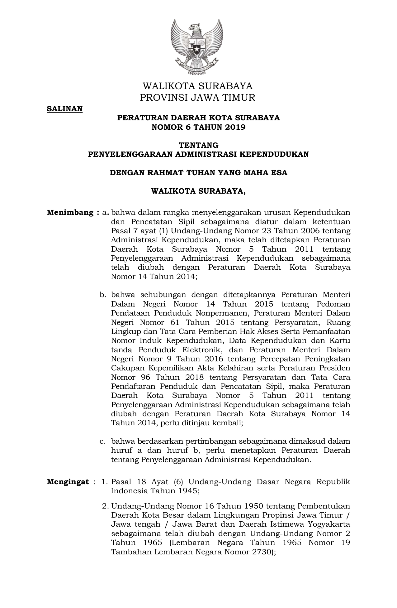 PERDA Nomor 6 Tahun 2019 | Peraturan Daerah Nomor 6 Tahun 2019 tentang PENYELENGGARAAN ADMINISTRASI KEPENDUDUKAN