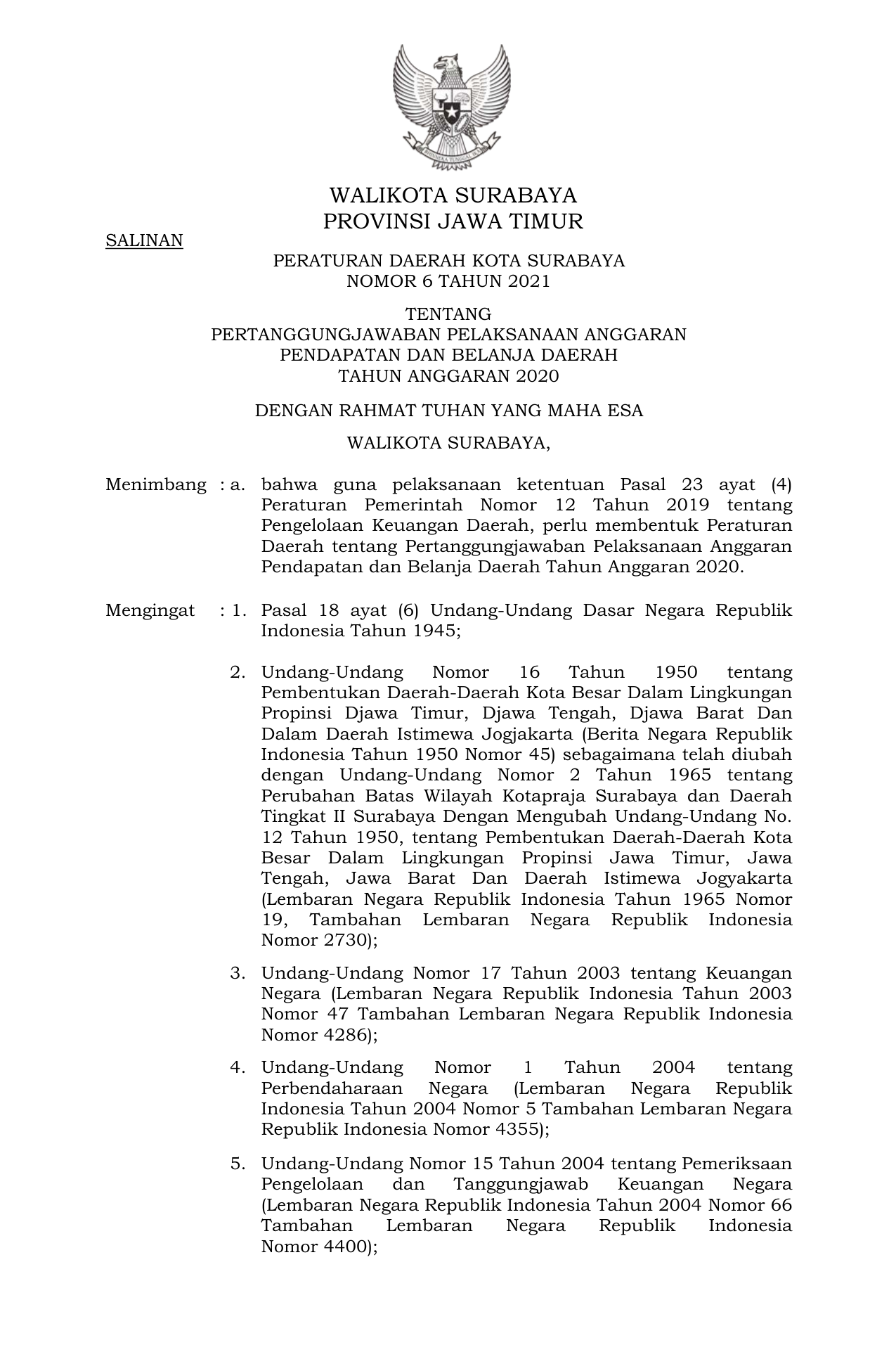 PERDA Nomor 6 Tahun 2021 | Peraturan Daerah Nomor 6 Tahun 2021 tentang PERTANGGUNGJAWABAN PELAKSANAAN ANGGARAN PENDAPATAN DAN BELANJA DAERAHTAHUN ANGGARAN 2020