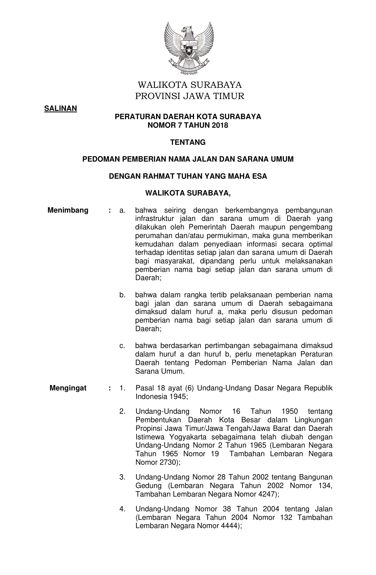 PERDA Nomor 7 Tahun 2018 | Peraturan Daerah Nomor 7 Tahun 2018 tentang PEDOMAN PEMBERIAN NAMA JALAN DAN SARANA UMUM