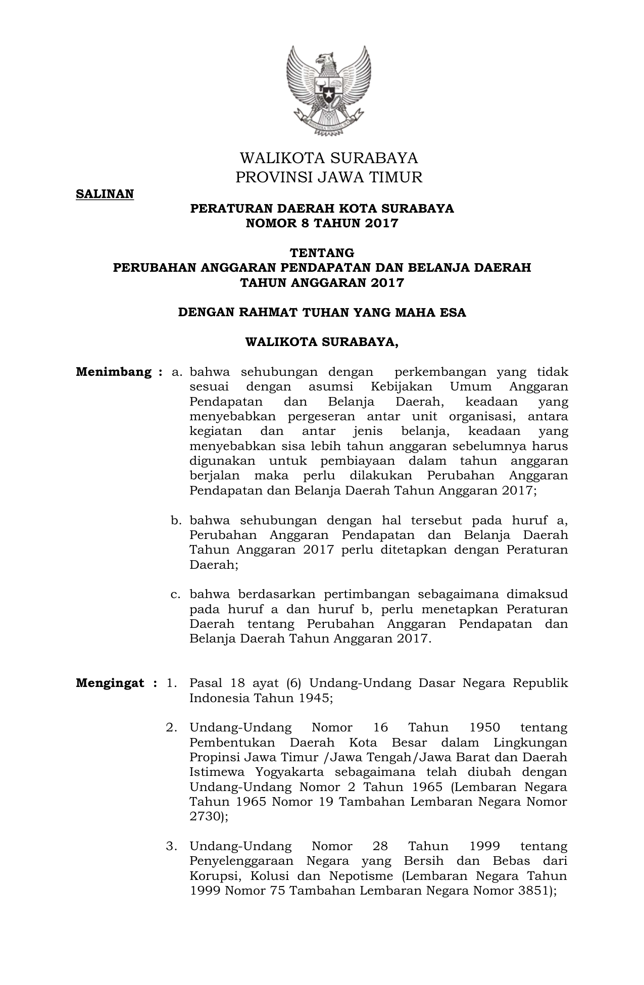 PERDA Nomor 8 Tahun 2017 | Peraturan Daerah Nomor 8 Tahun 2017 tentang PERUBAHAN ANGGARAN PENDAPATAN DAN BELANJA DAERAH